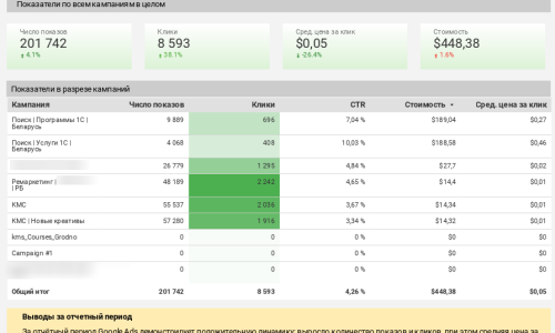 Для ускорения запуска и снижения затрат на продакшен были использованы AI-инструменты при создании креативов. Это дало возможность быстро масштабировать тестирование гипотез и запускать новые варианты объявлений. Группы объявлений были сегментированы под разные направления: продукты 1С (программы, аренда) и сервисные услуги (внедрение, интеграции, сопровождение). Такой подход повысил релевантность коммуникаций для разных сегментов аудитории.