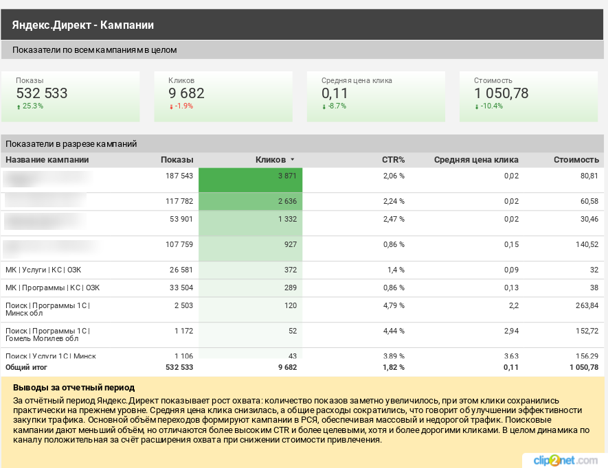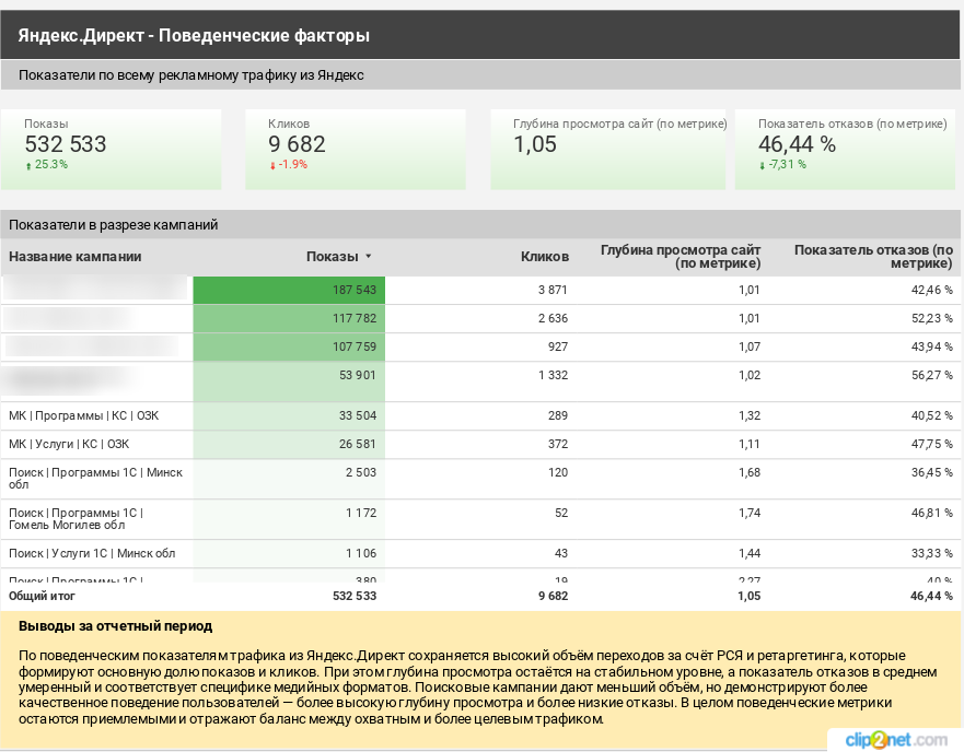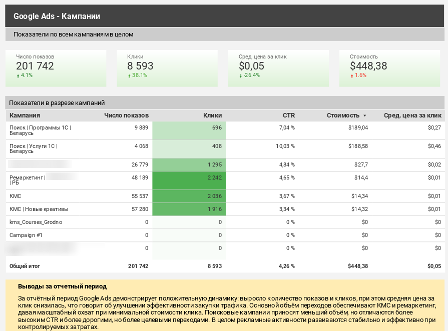 Мы выстроили стратегию работы с несформированным спросом, выделив отдельные рекламные кампании под верх воронки. В основе подхода — коммуникация не от бренда или продукта, а от проблем бизнеса: учета, контроля, прозрачности и ручных процессов. Кампании были запущены в Яндекс.Директ (РСЯ) и Google Ads (КМС) с фокусом на расширение воронки и рост мультиканальных конверсий.