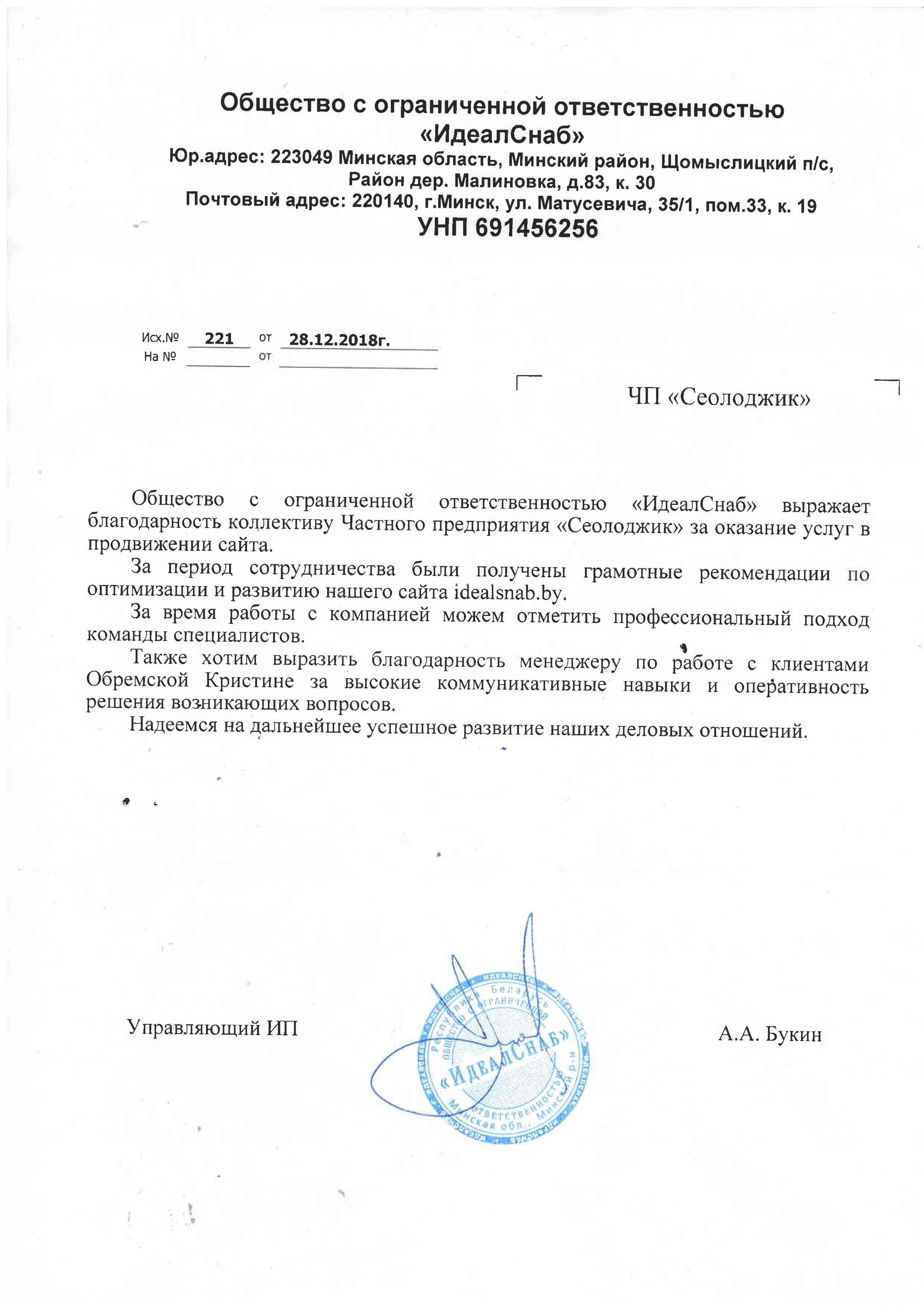 Общество с ограниченной ответственностью «ИдеалСнаб» выражает благодарность коллективу Частного предприятия...