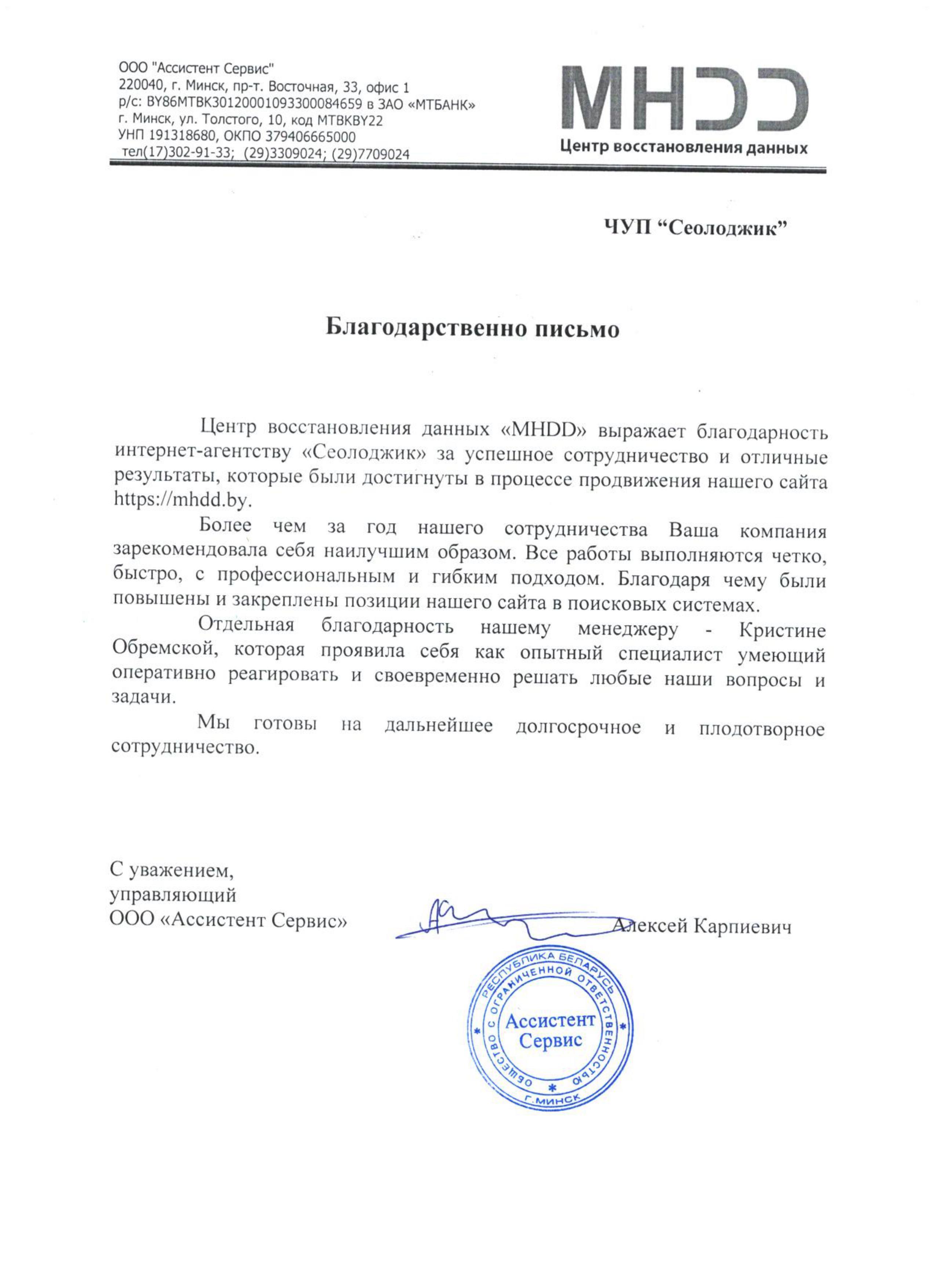 Центр восстановления данных «МНDD» выражает благодарность интернет-агентству «Сеолоджик» за успешное...