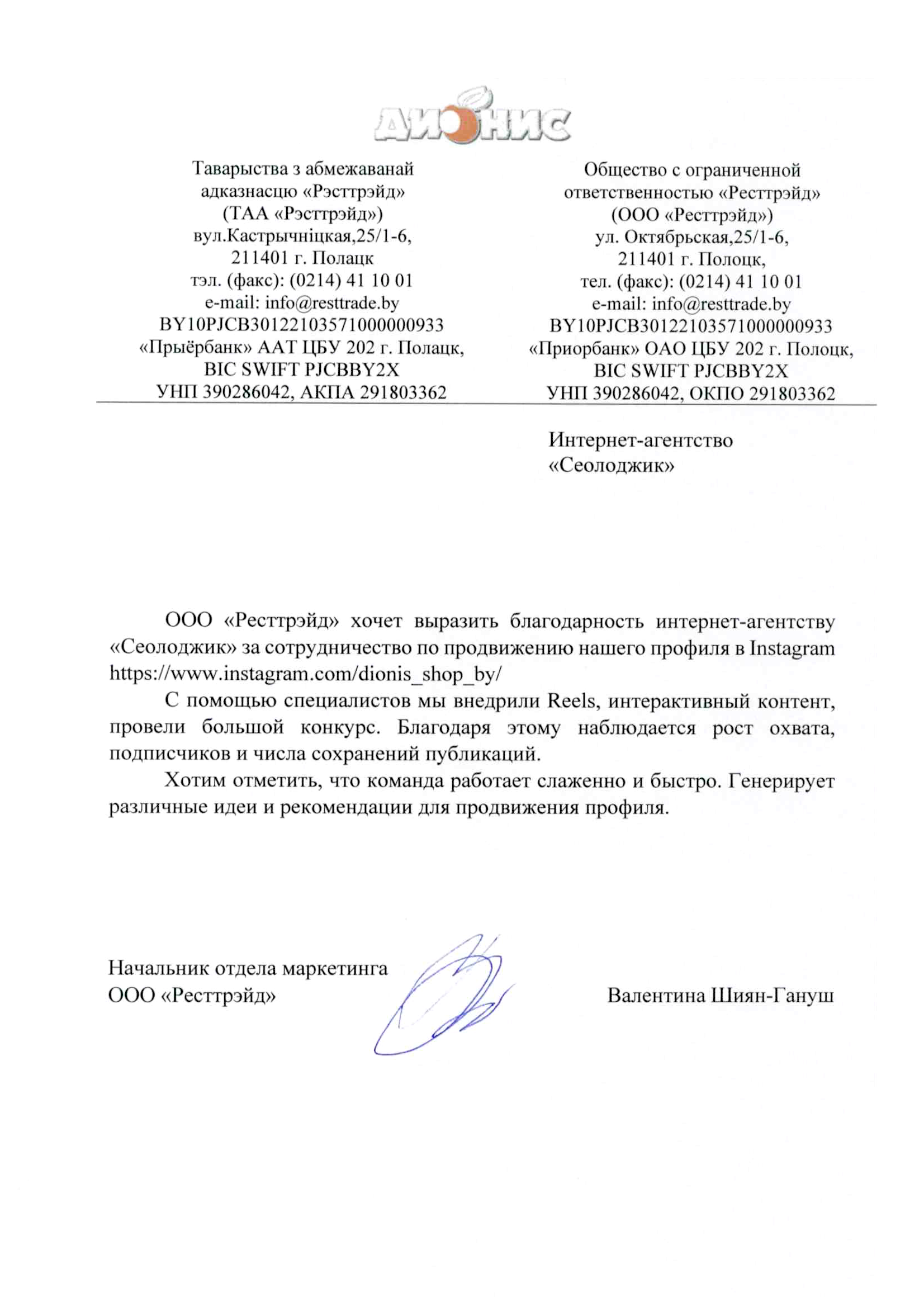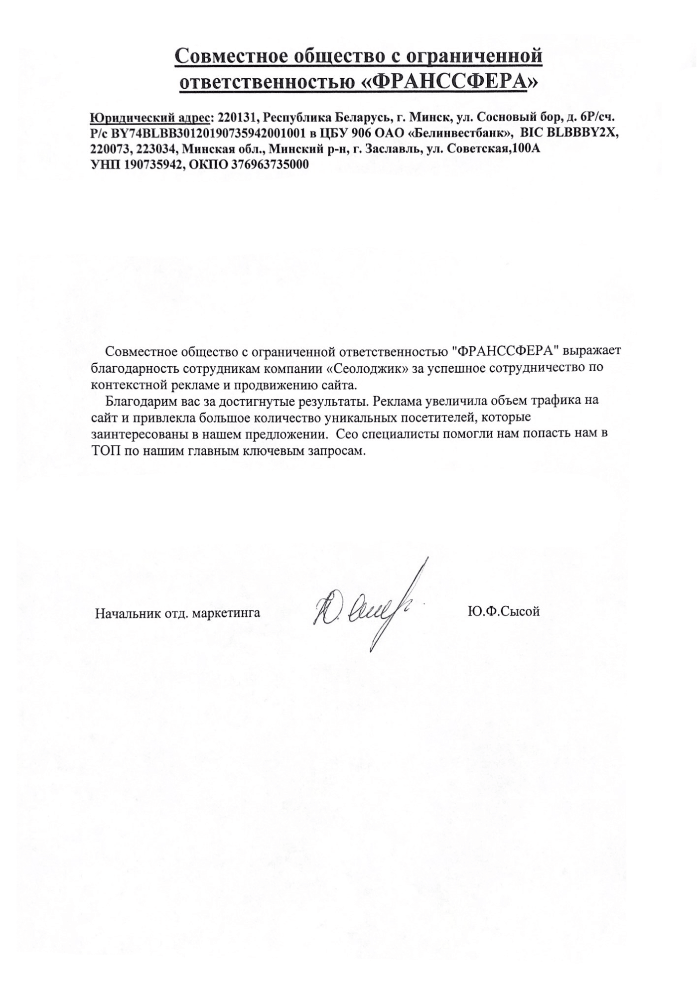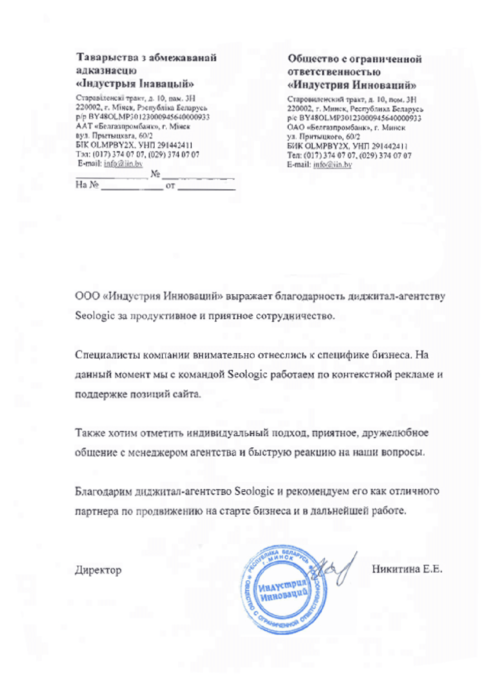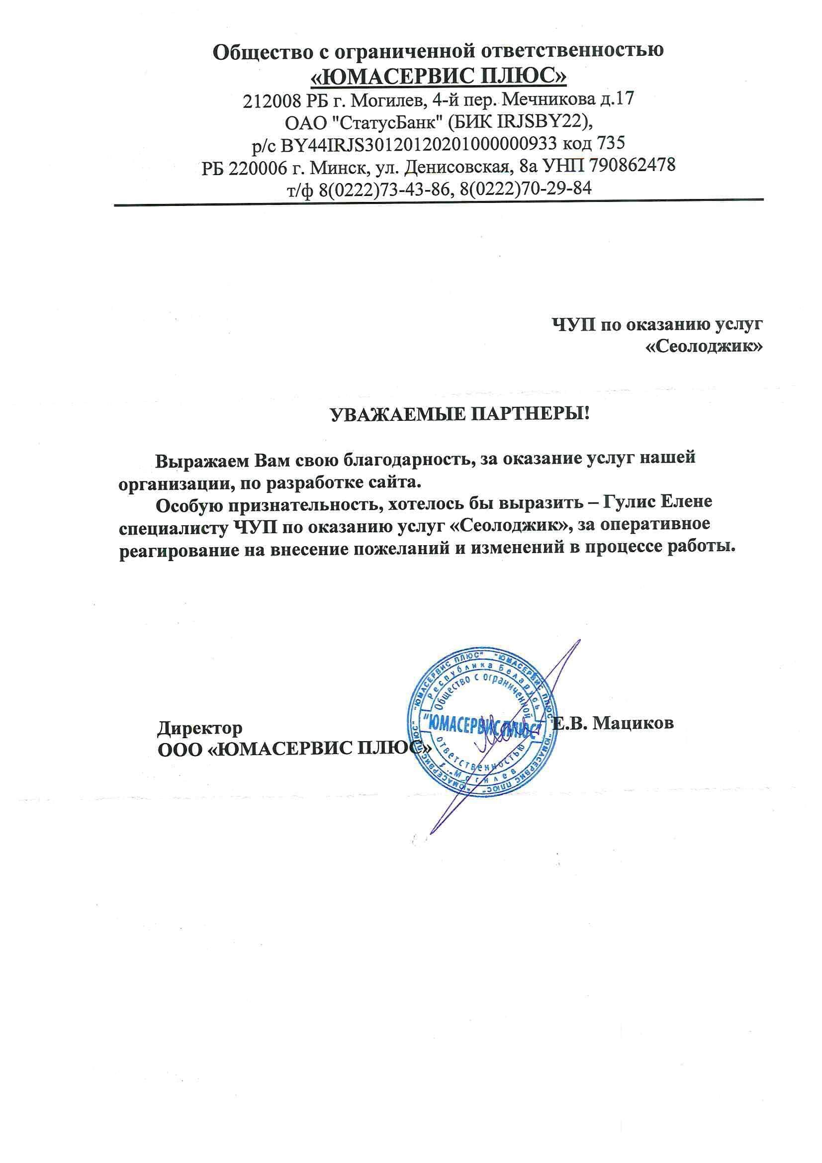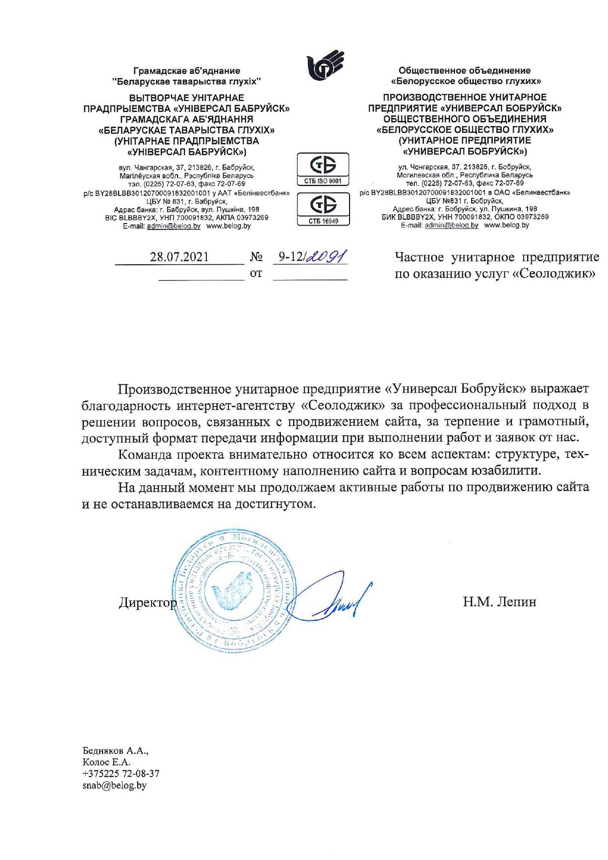 Производственное унитарное предприятие «Универсал Бобруйск» выражает благодарность интернет-агентству «Сеолоджик» за...