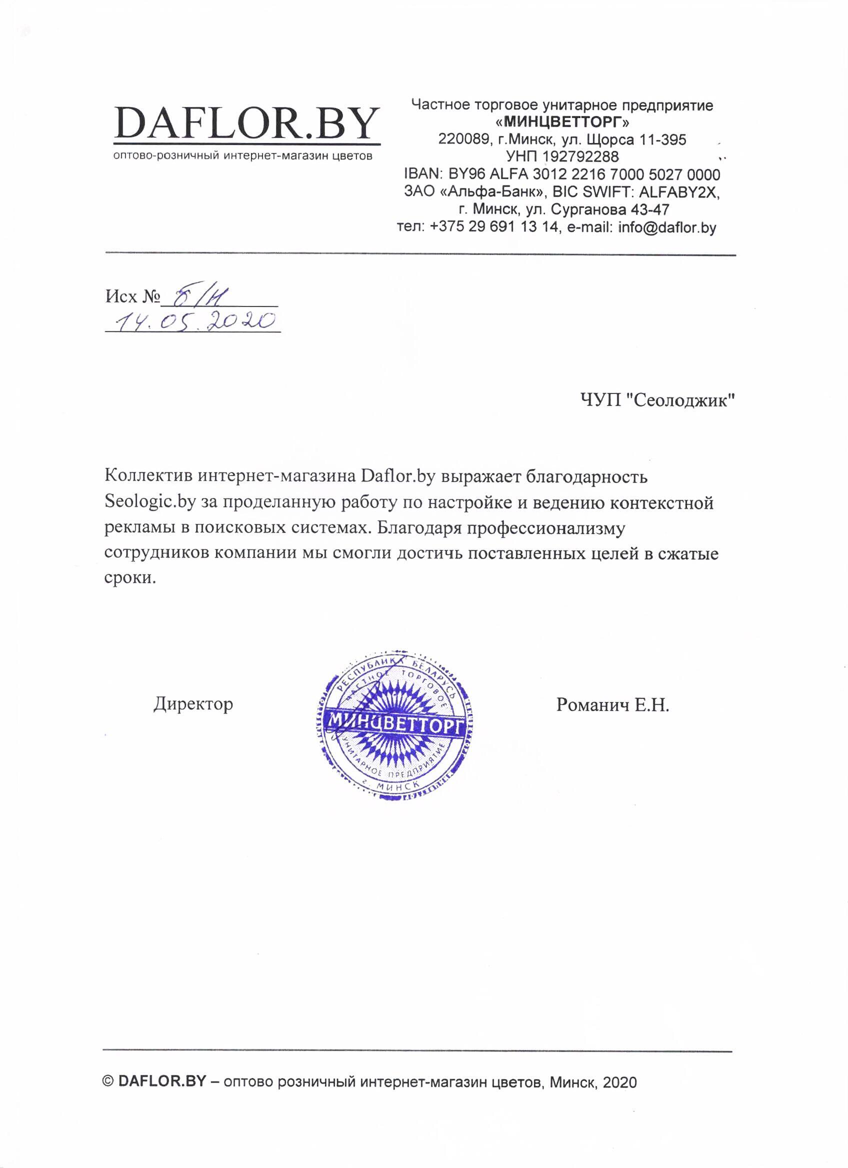 Коллектив интернет-магазина Daflor.by выражает благодарность Seologic.by за проделанную работу по...