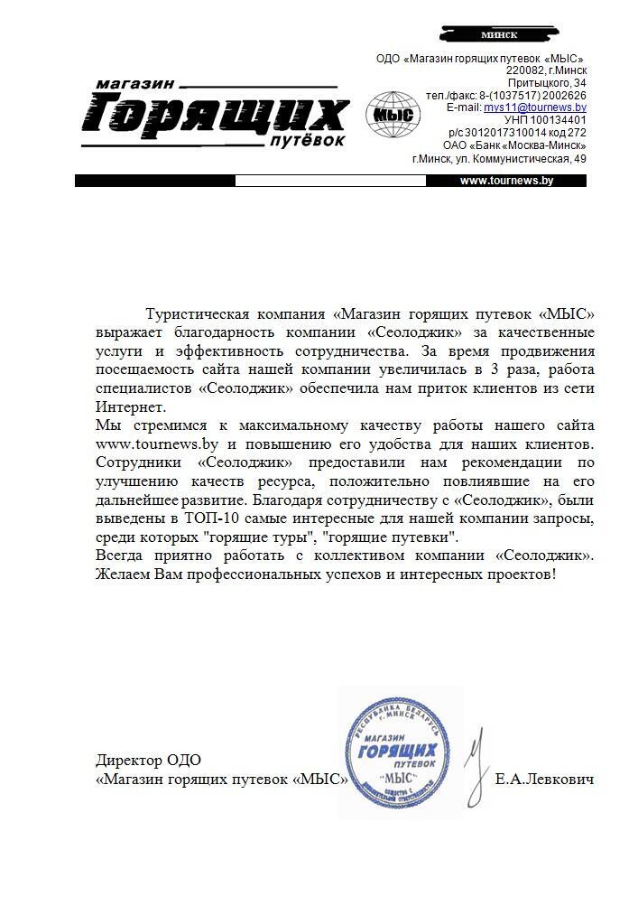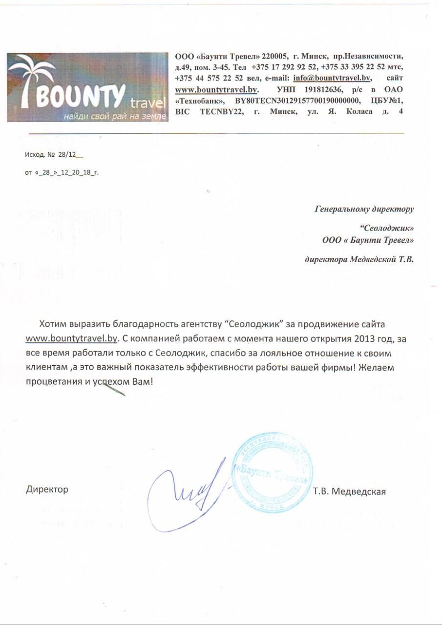 Хотим выразить благодарность агентству "Сеолоджик" за продвижение сайта bountytravel.by....