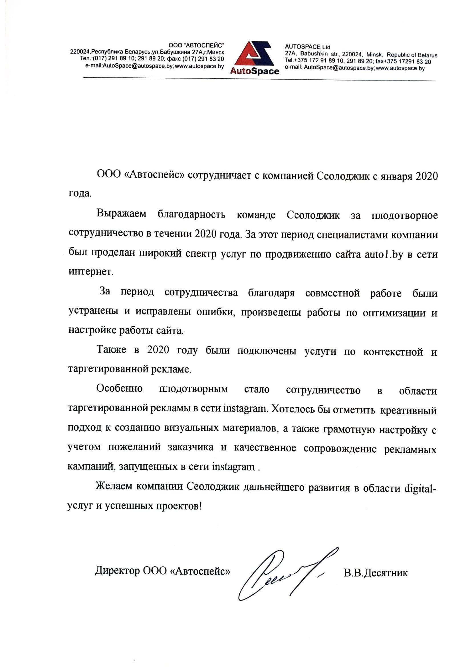 ООО «Автоспейс» сотрудничает с компанией Сеолоджик с января 2020 года....