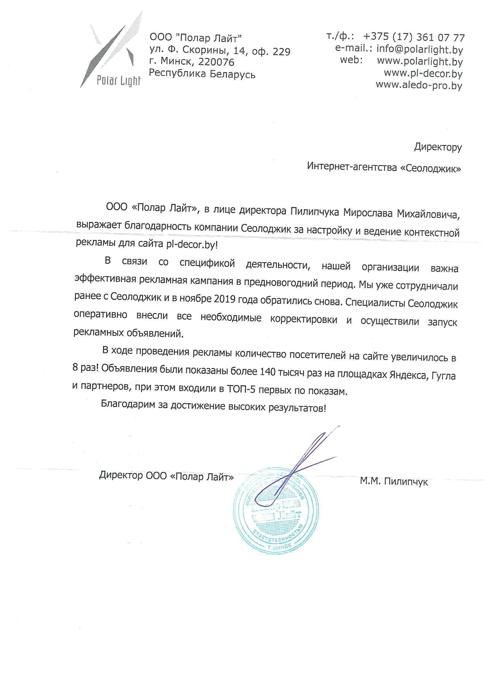 ООО «Полар Лайт», в лице директора Пилипчука Мирослава Михайловича, выражает...