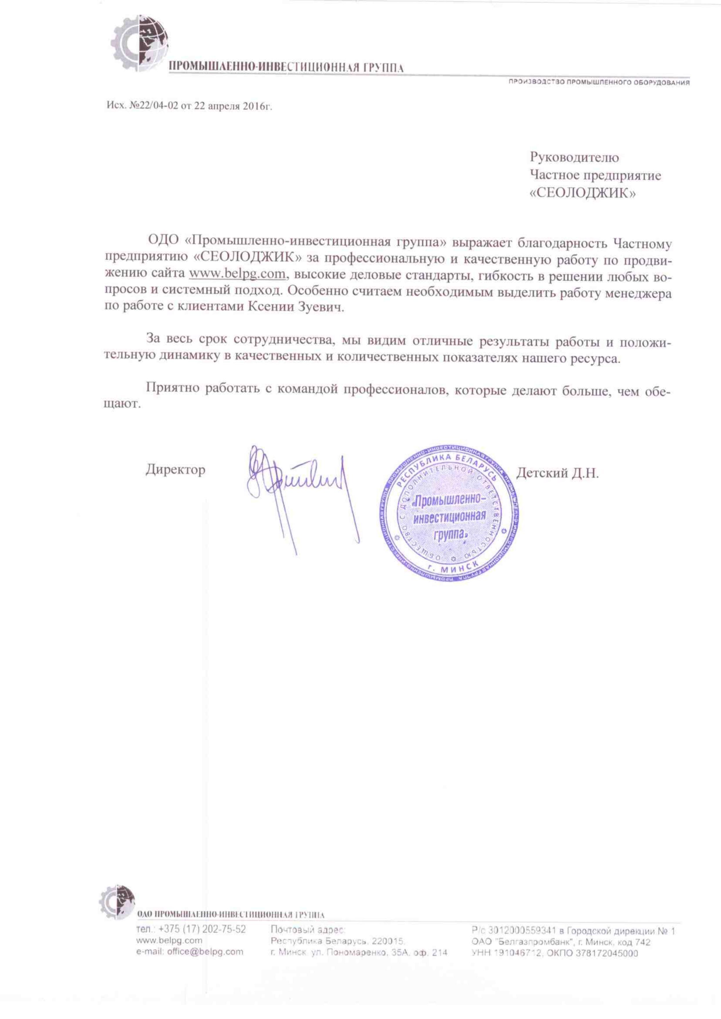 ОДО «Промышленно-инвестиционная группа» выражает благодарность Частному предприятию «СЕОЛОДЖИК» за профессиональную...