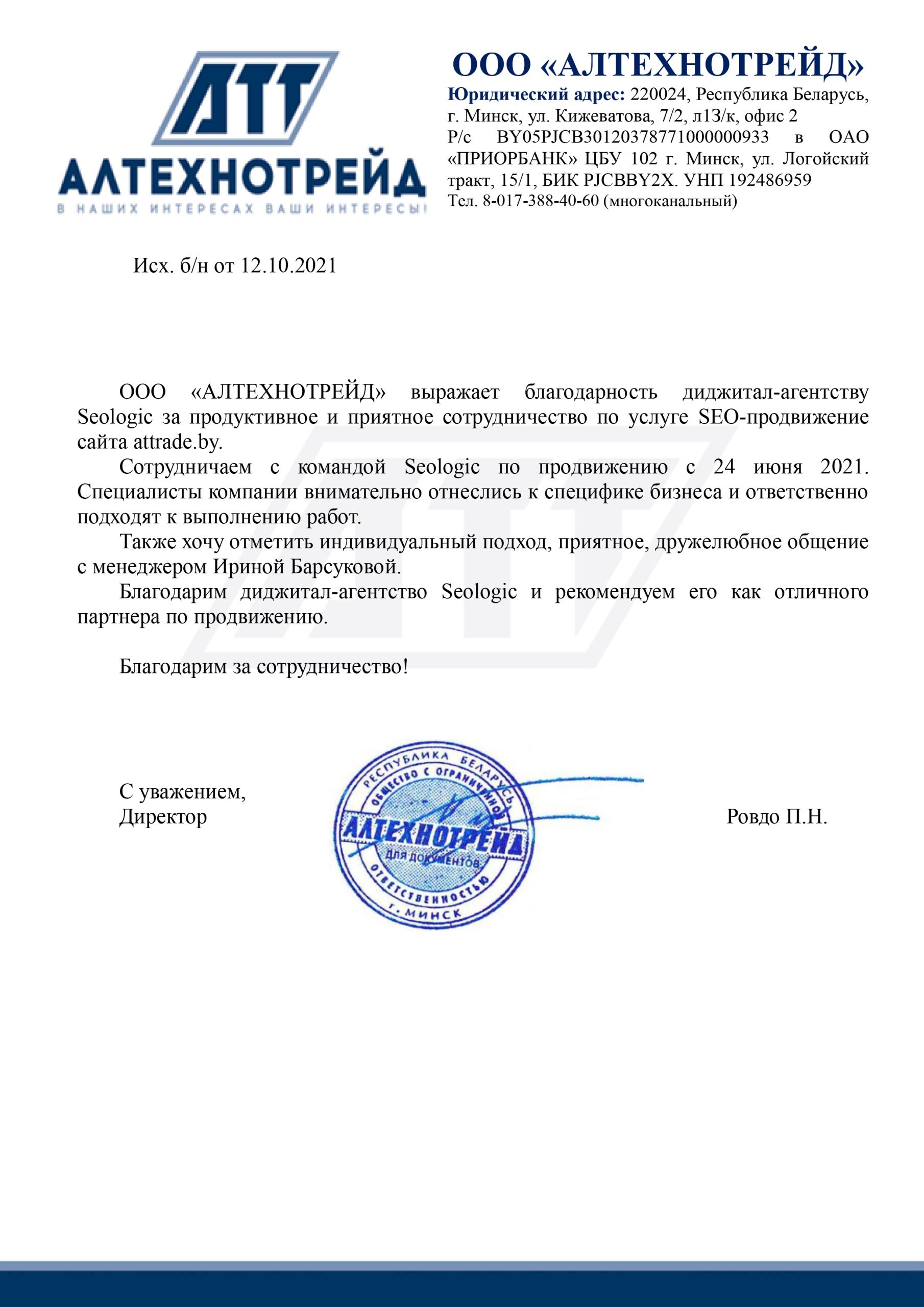 ООО «АЛ ТЕХНОТРЕЙД» выражает благодарность диджитал-агентству Seologic за продуктивное и...