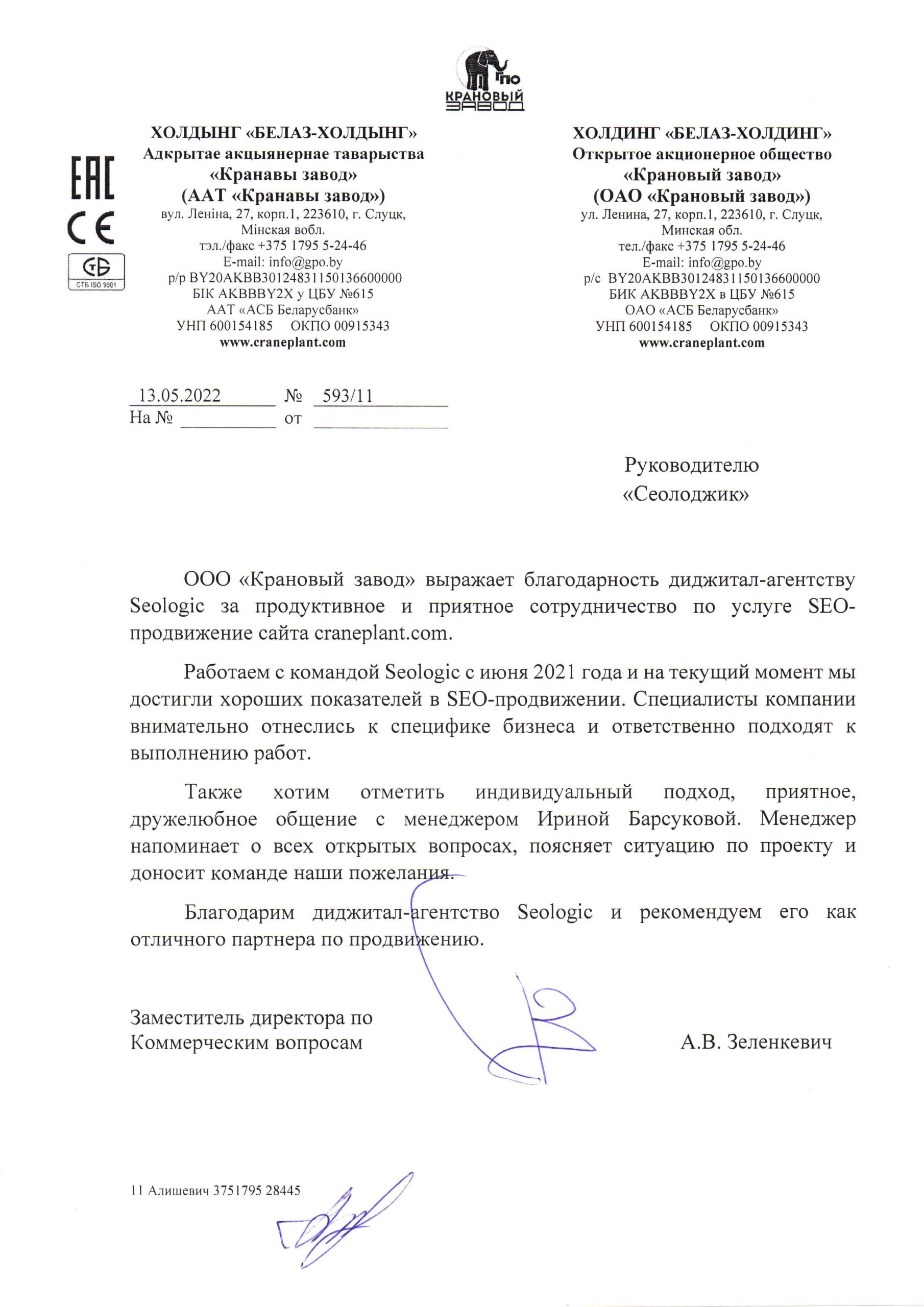 ООО «Крановый завод» выражает благодарность диджитал-агентству Seologic за продуктивное и...