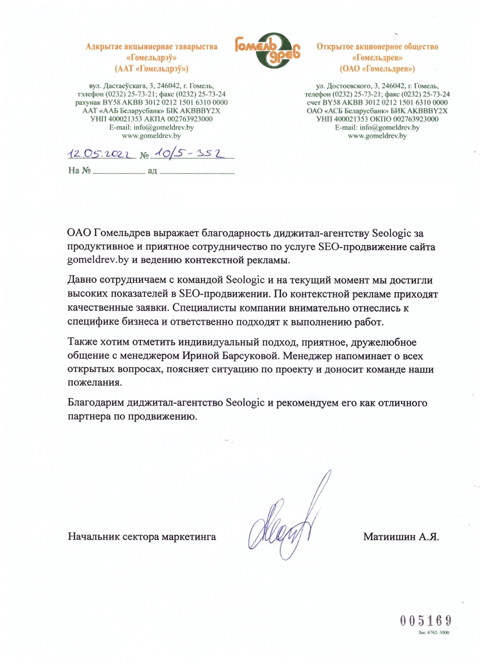 ОАО Гомельдрев выражает благодарность диджитал-агентству Seologic за продуктивное и приятное...