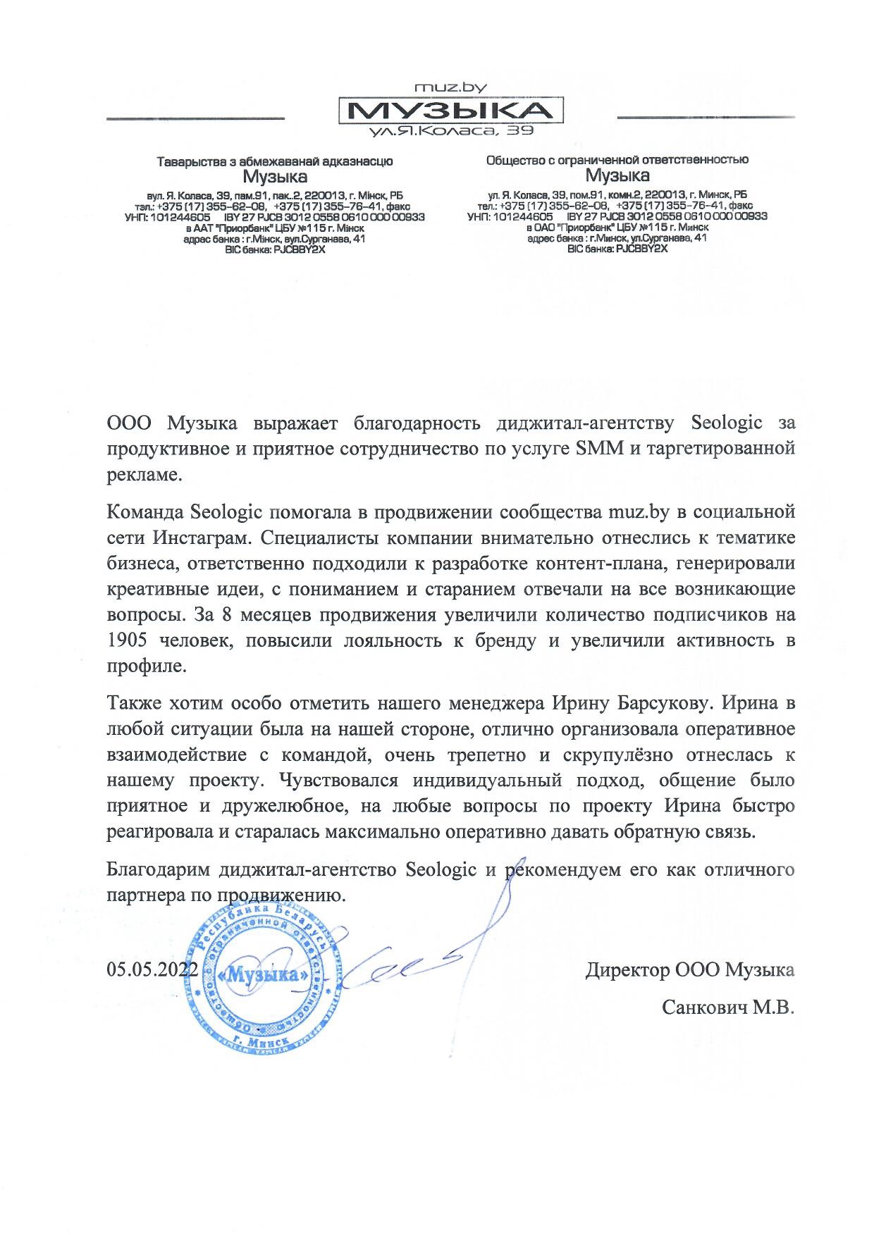 ООО Музыка выражает благодарность диджитал-агентству Seologic за продуктивное и приятное...
