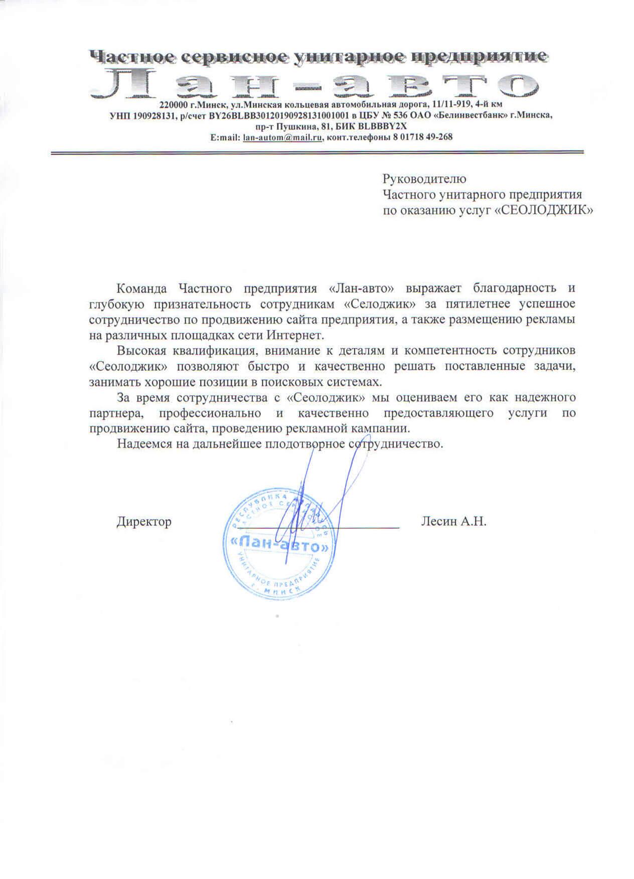 Команда Частного предприятия «Лан-авто» выражает благодарность и глубокую признательность сотрудникам...