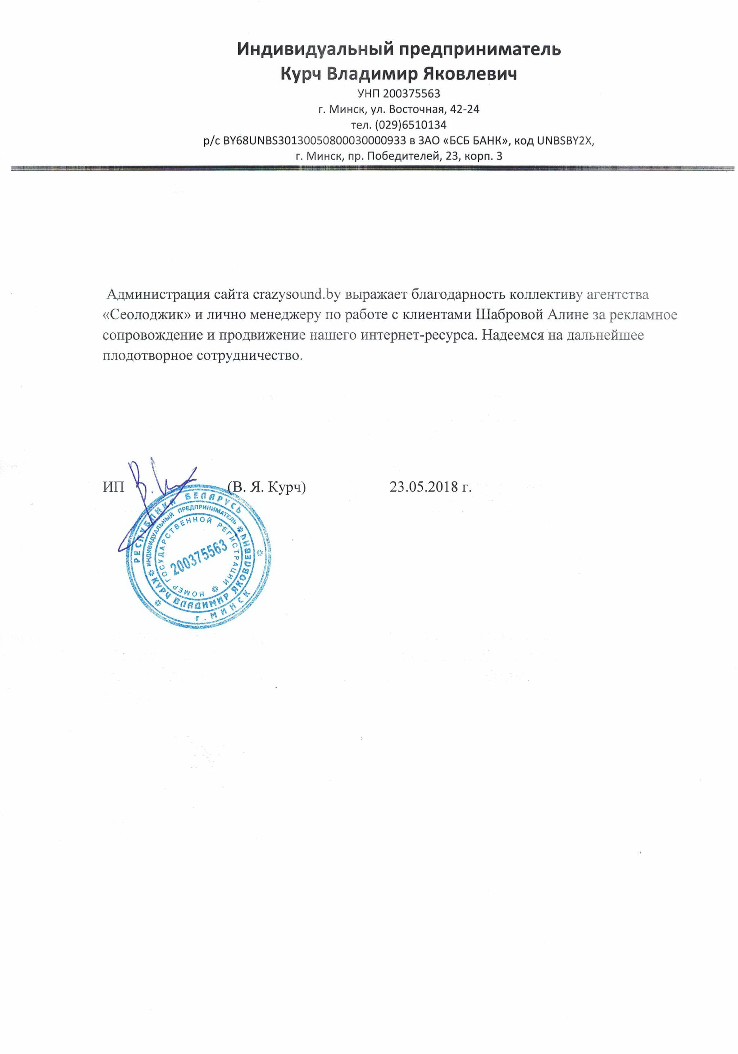 Администрация сайта crazysound.by выражает благодарность коллективу агентства «Сеолоджик» и лично...