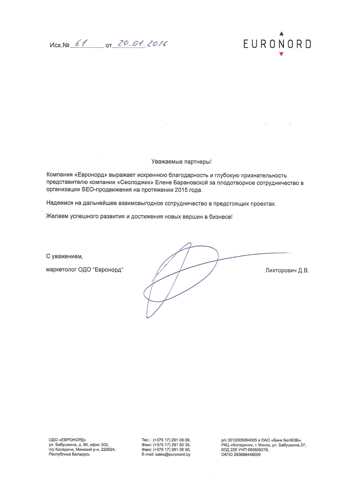 Компания «Евронорд» выражает искреннюю благодарность и глубокую признательность компании «Сеолоджик»...