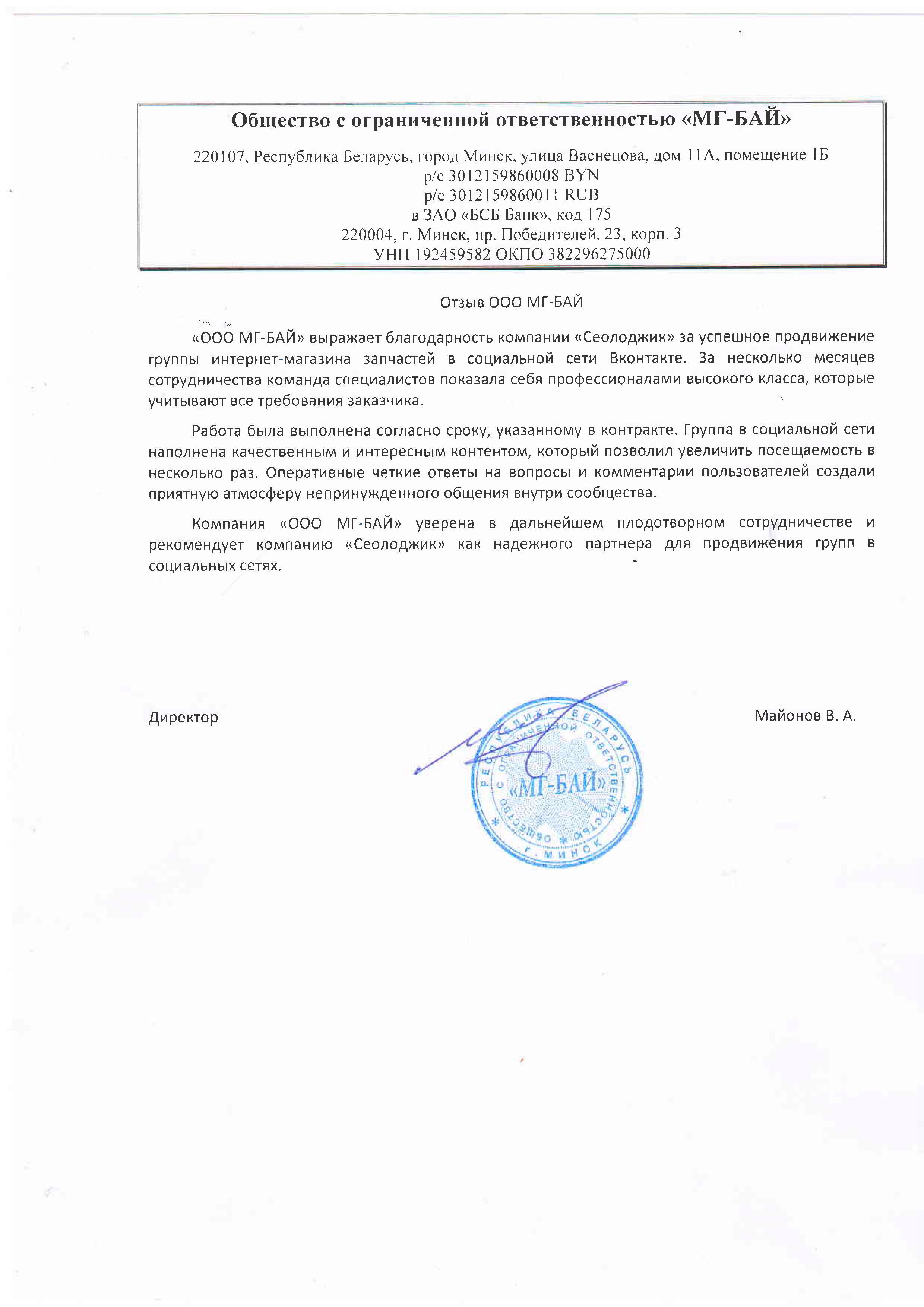 «ООО МГ-БАЙ» выражает благодарность компании «Сеолоджик» за успешное продвижение группы...