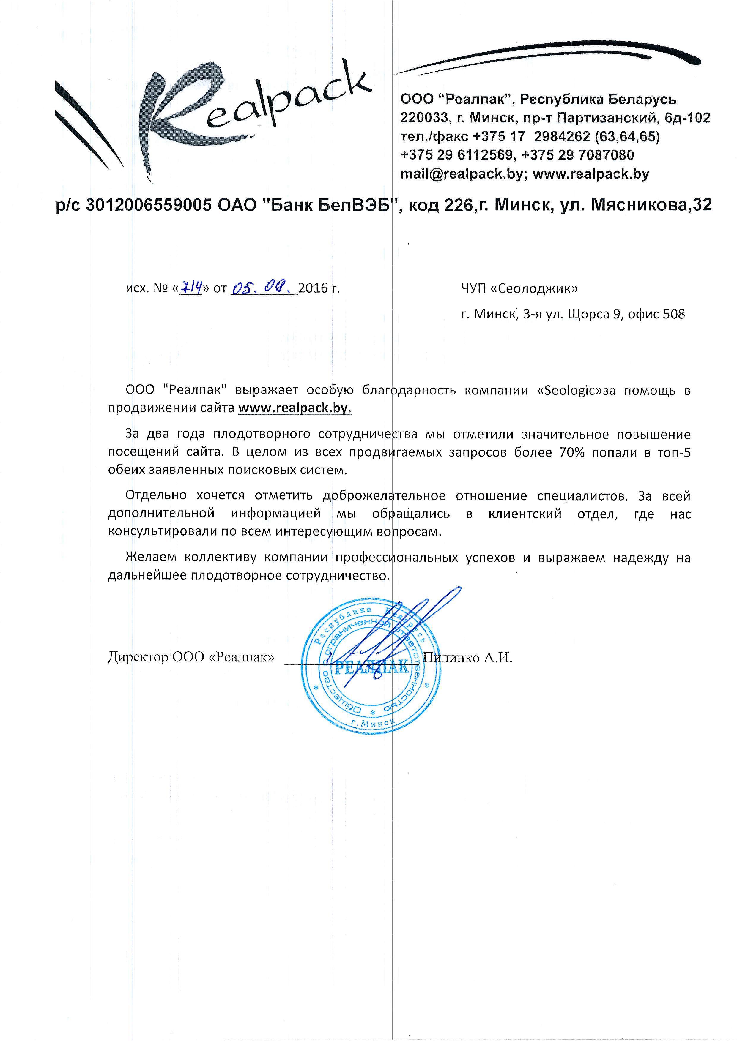 ООО «Реалпак» выражает особую благодарность компании «Seologic» за помощь в...