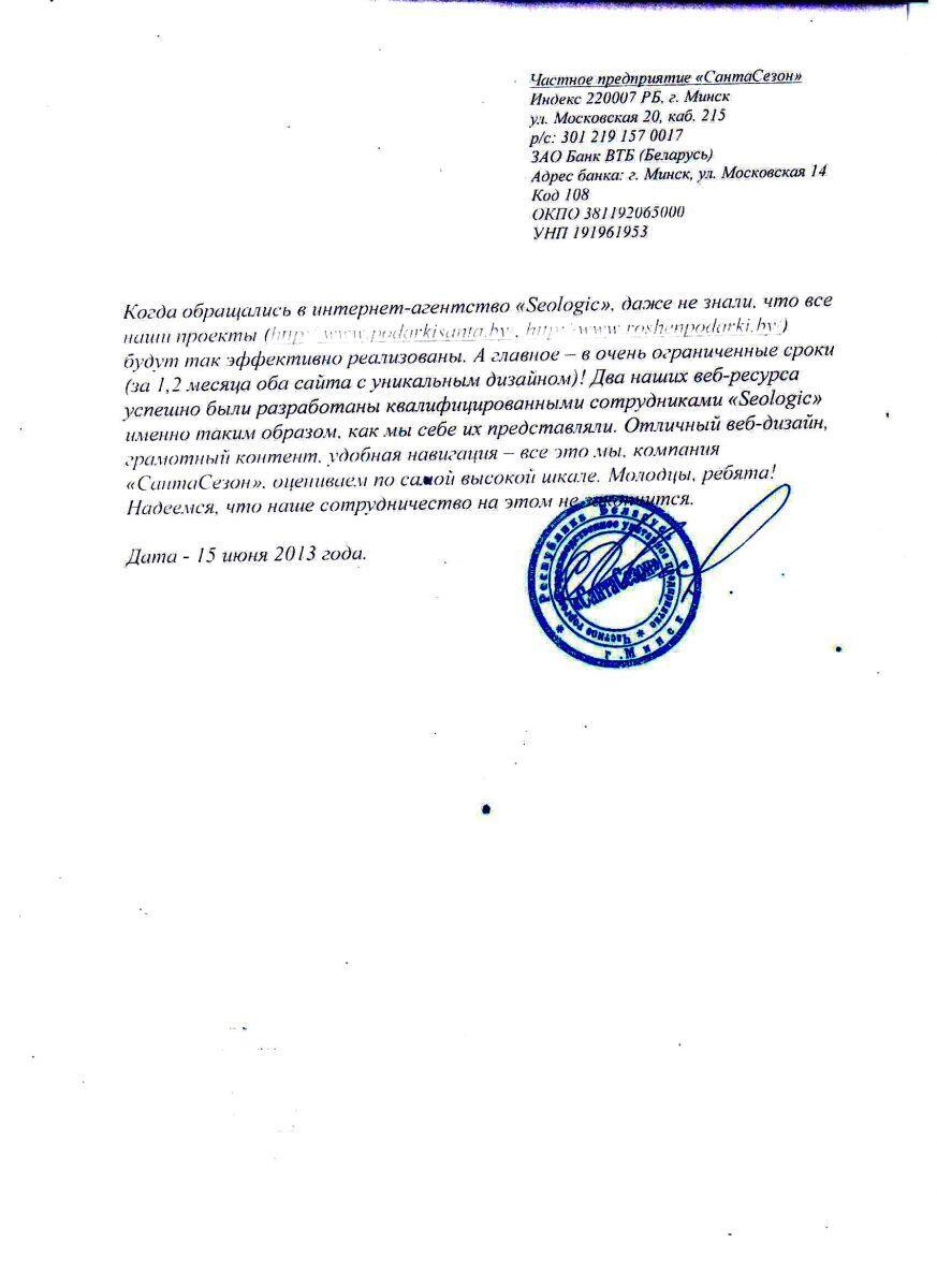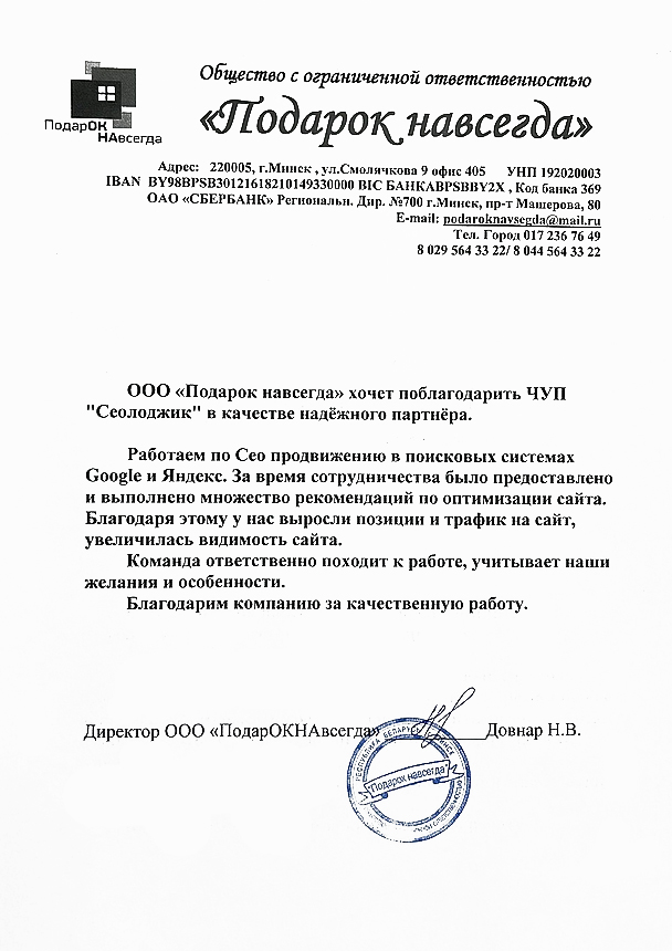 ООО «Подарок навсегда» хочет поблагодарить ЧУП "Сеолоджик" в качестве надёжного...