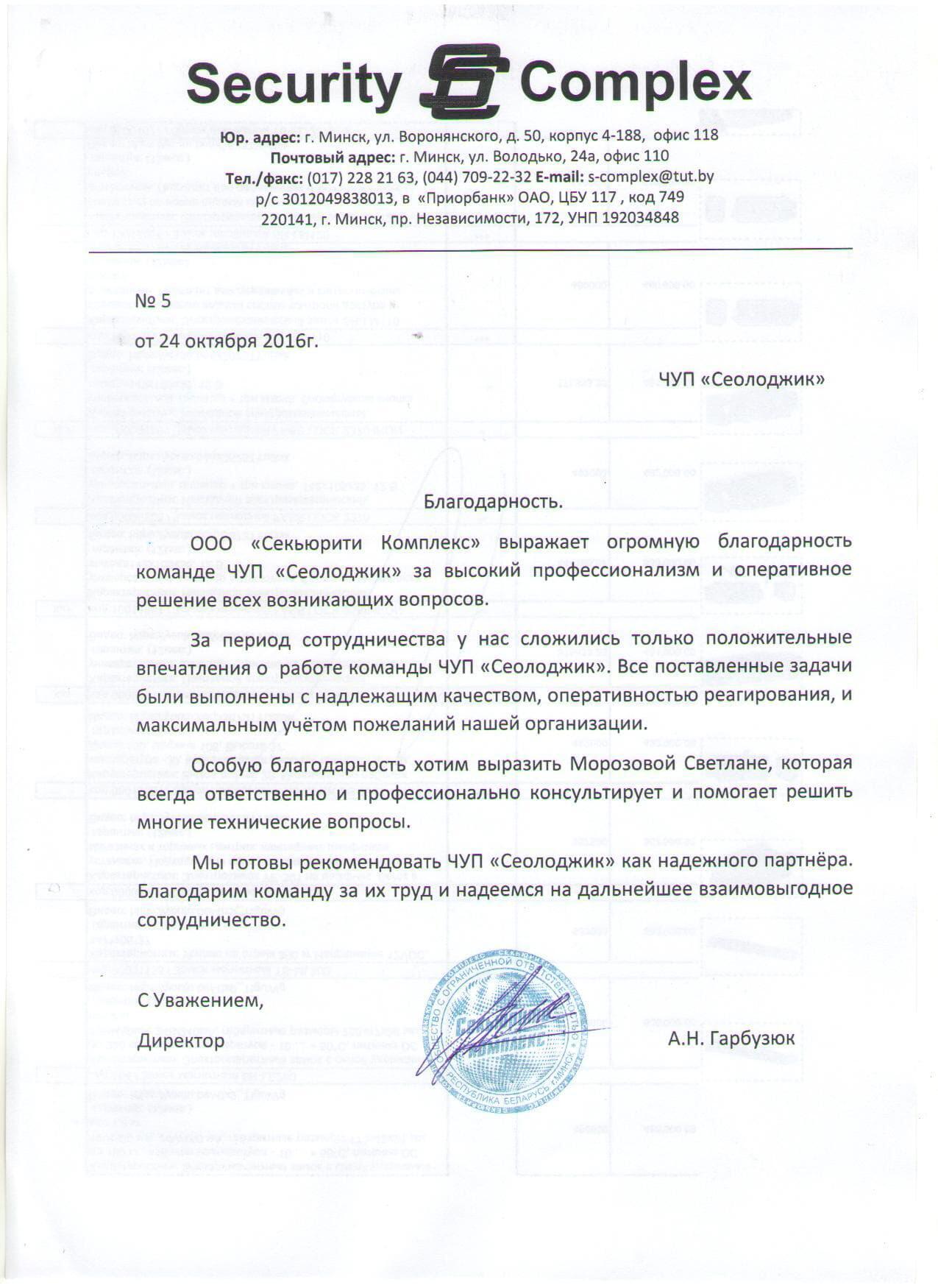 ООО «Секьюрити Комплекс» выражает огромную благодарность команде ЧУП «Сеолоджик» за...