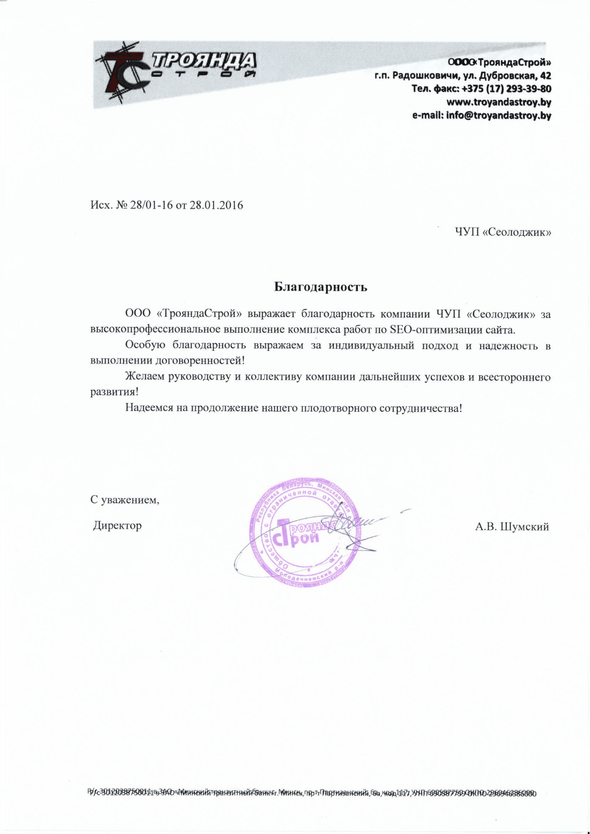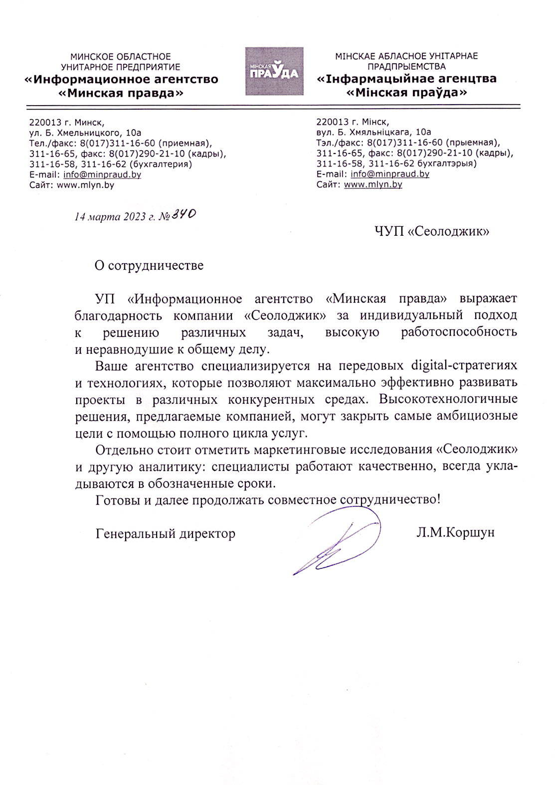 УП «Информационное агентство «Минская правда» выражает благодарность компании «Сеолоджик» за...