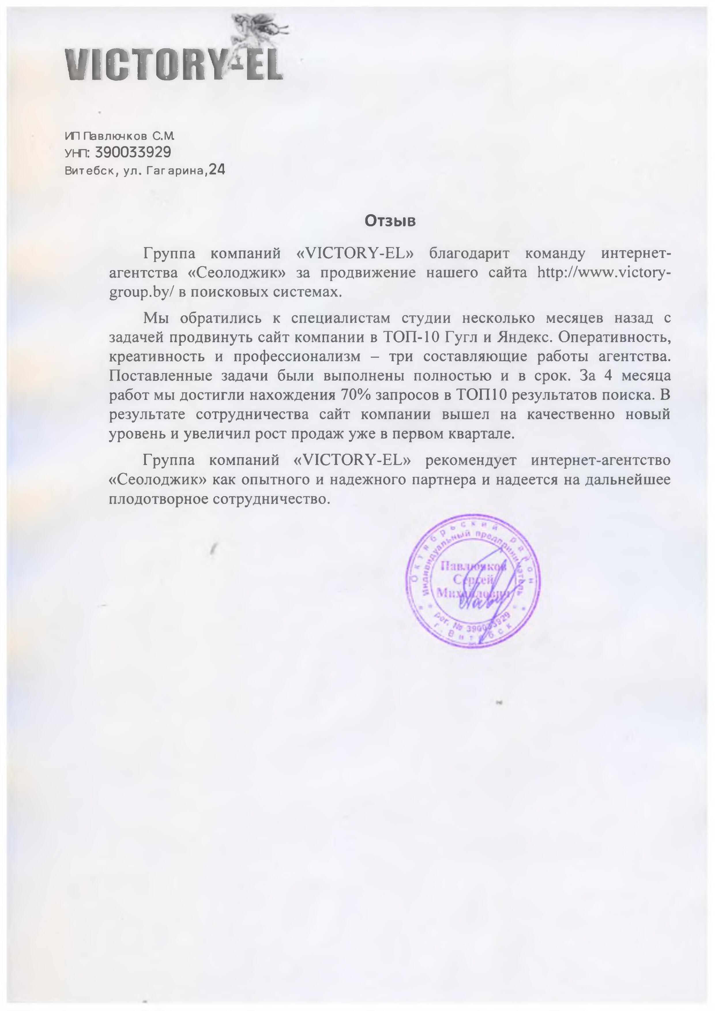 Группа компаний «VICTORY-EL» благодарит команду интернет-агентства «Сеолоджик» за продвижение нашего...
