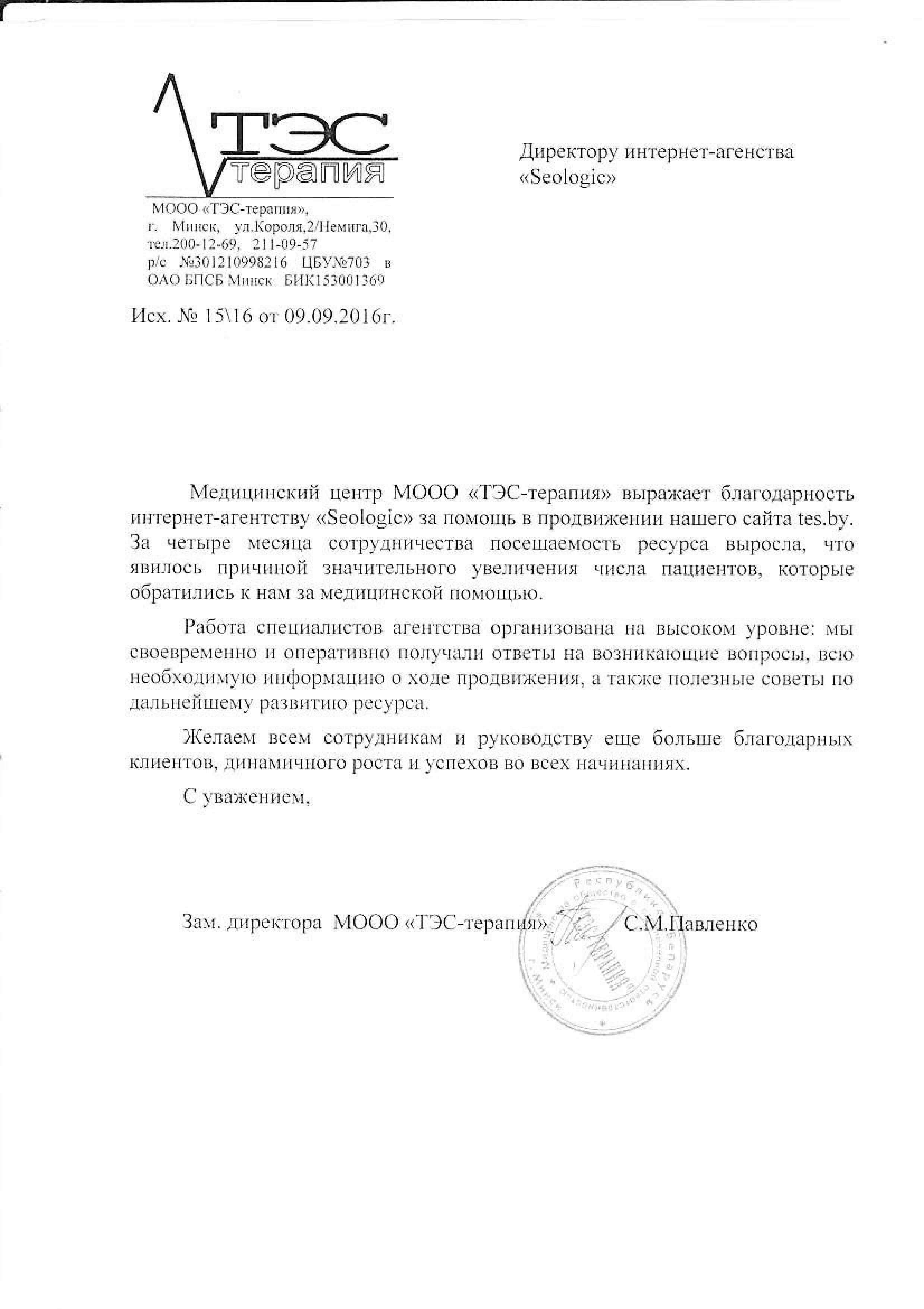 Медицинский центр МООО «ТЭС-терапия» выражает благодарность интернет-агентству «Seologic» за помощь...