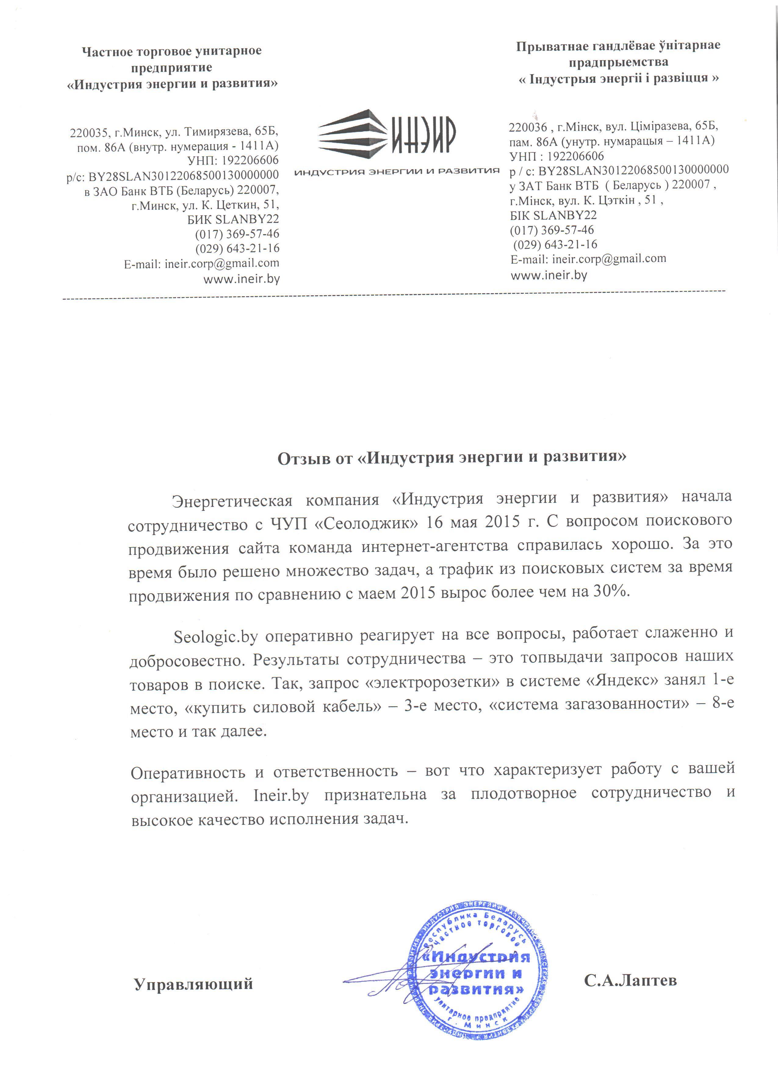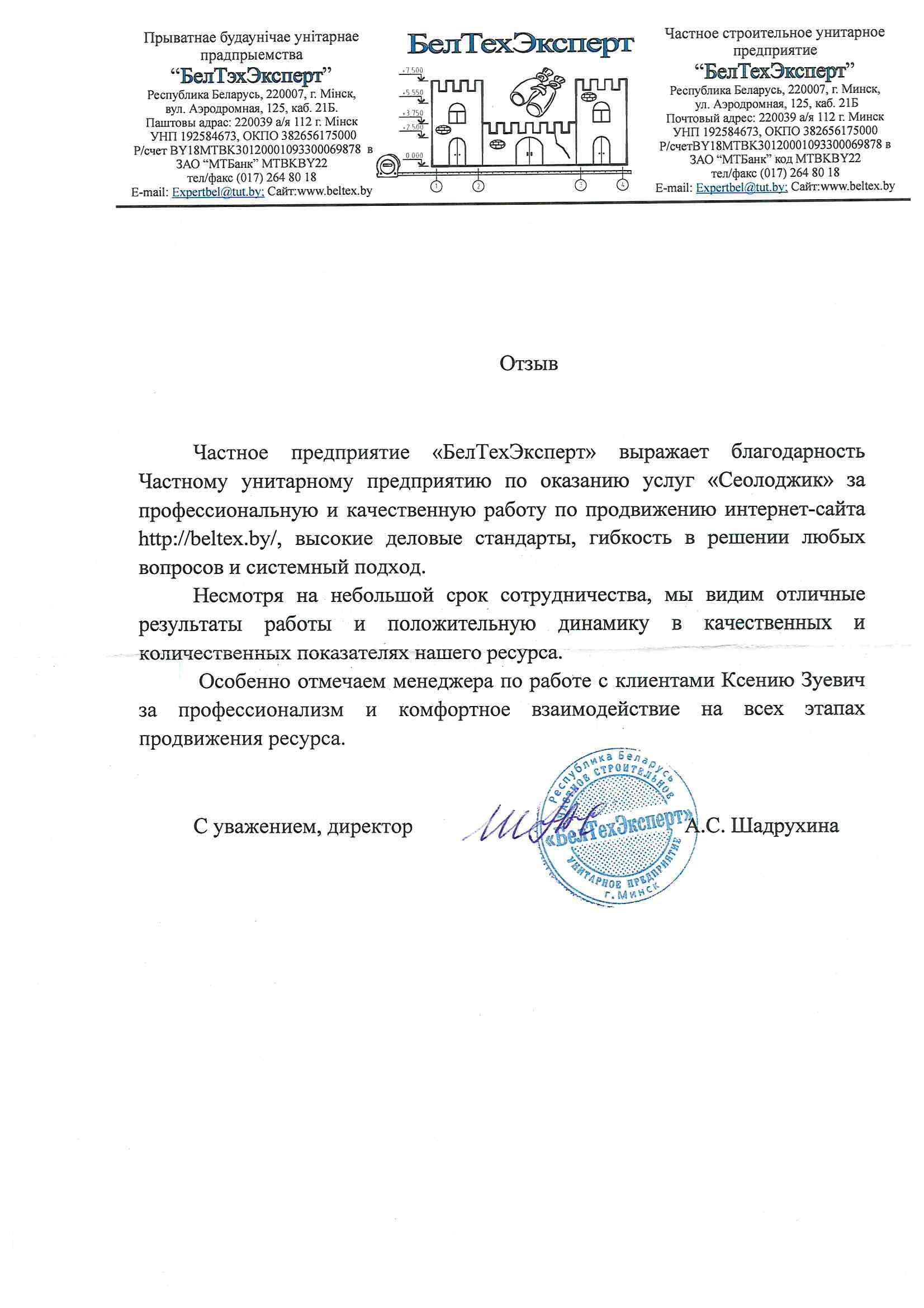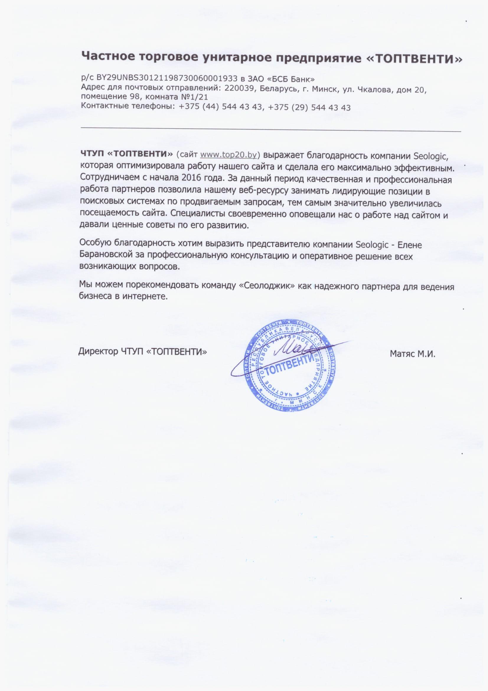 ЧТУП «ТОПТВЕНТИ» (сайт top20.by) выражает благодарность компании Seologic, которая оптимизировала...