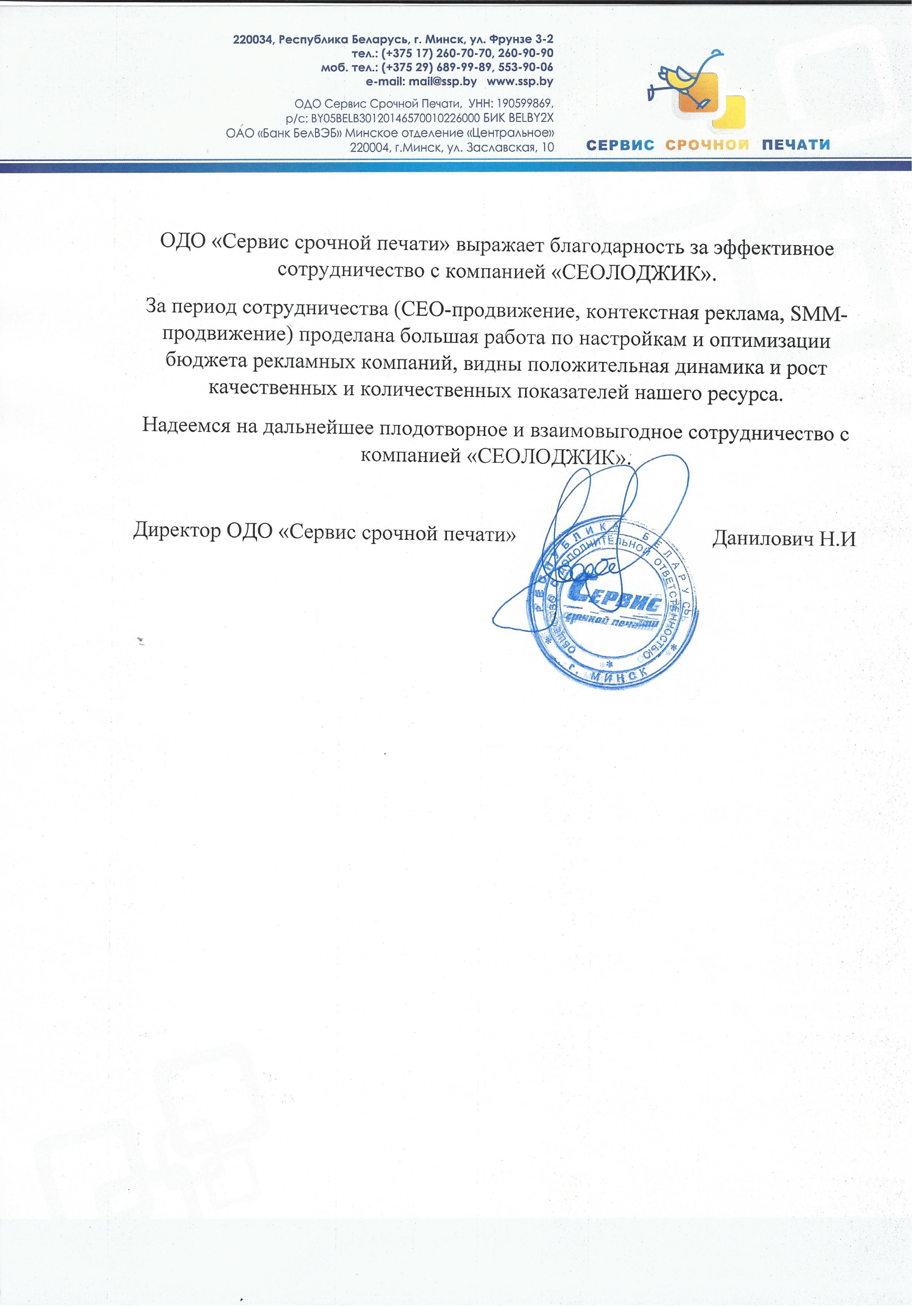 ОДО «Сервис срочной печати» выражает благодарность за эффективное сотрудничество с...