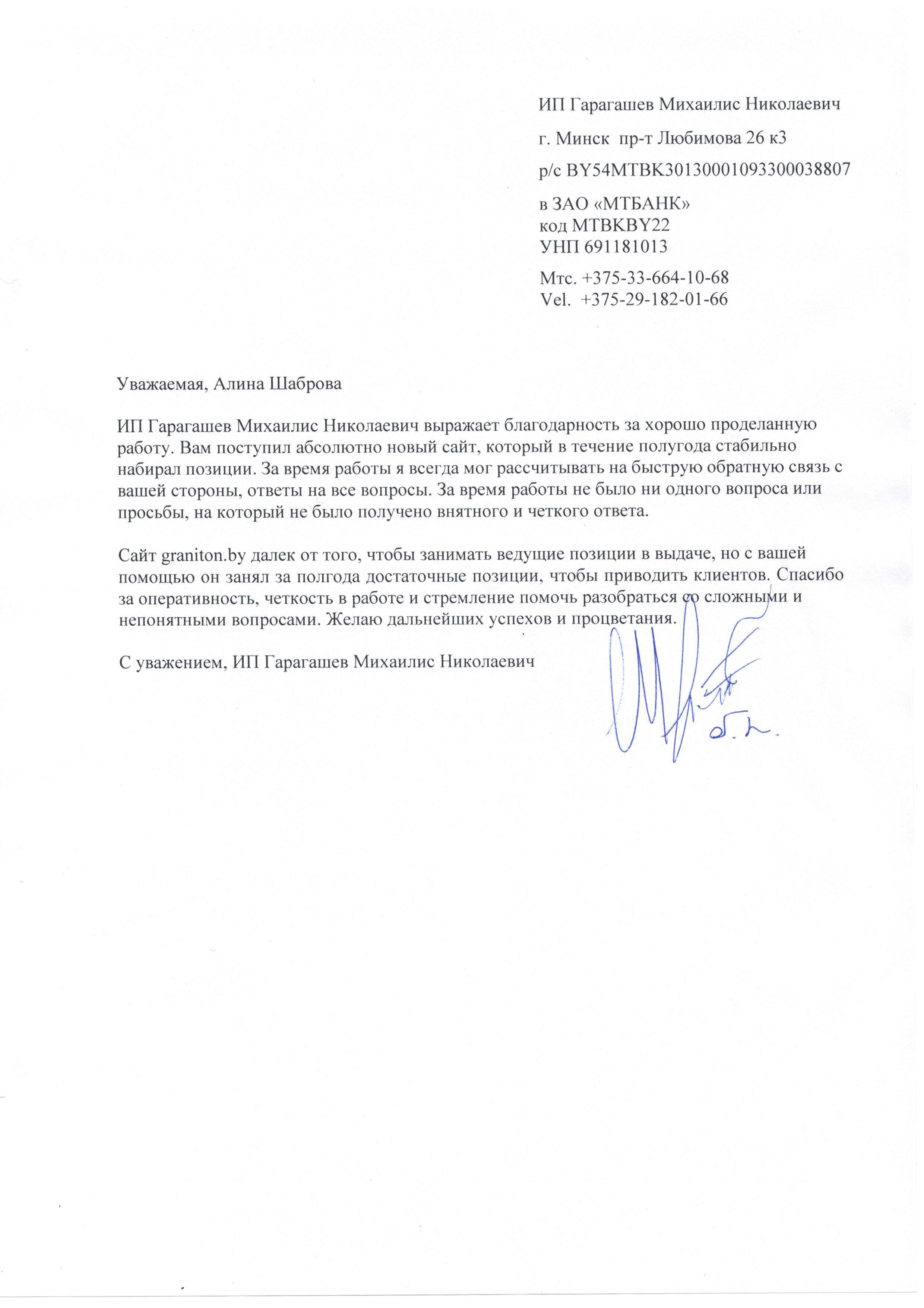 ИП Гарагашев Михаилис Николаевич выражает благодарность за хорошо проделанную работу....