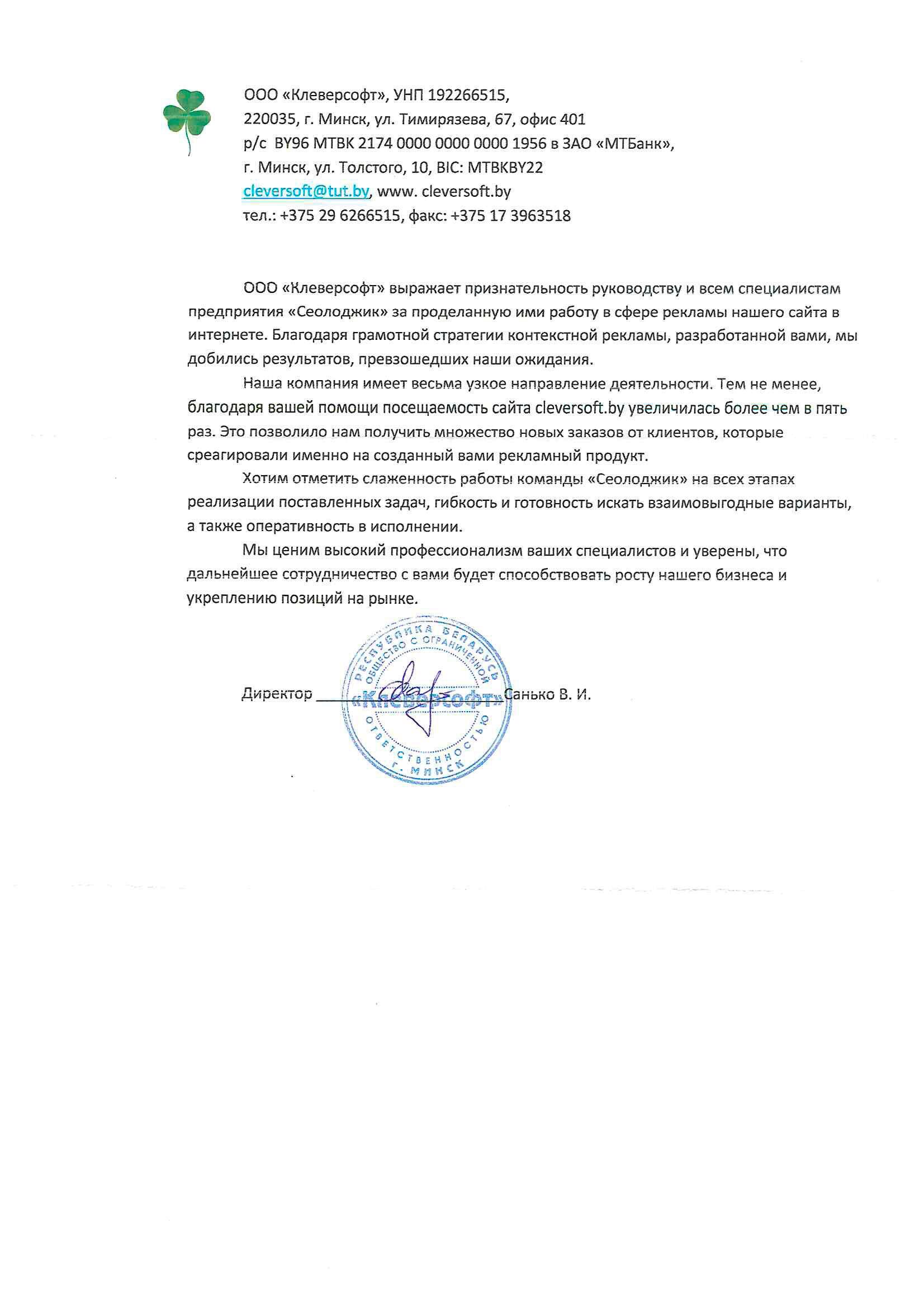ООО «Клеверсофт» выражает признательность руководству и всем специалистам предприятия «Сеолоджик»...