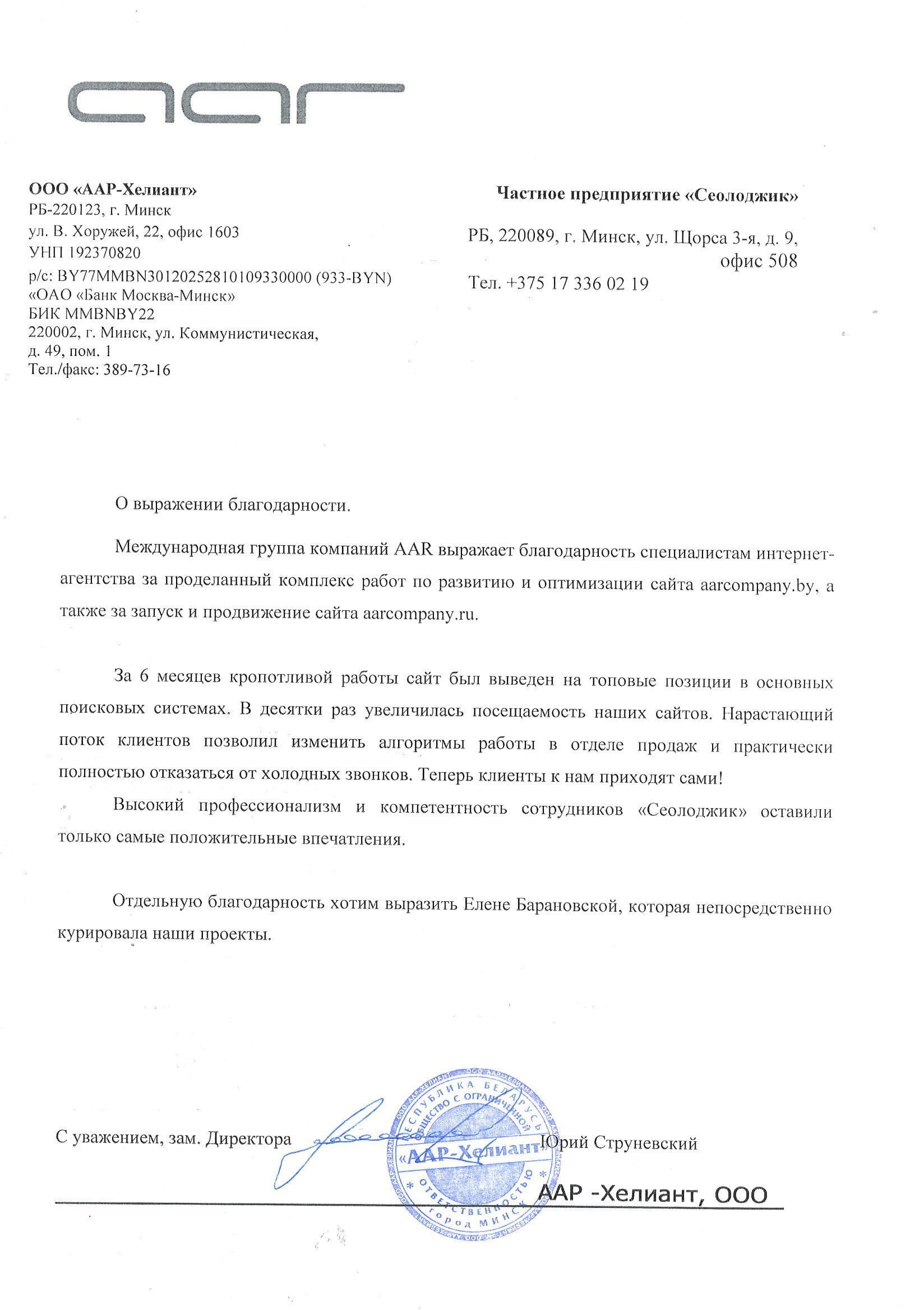 Международная группа компаний AAR выражает благодарность специалистам интернет-агентства за проделанный...