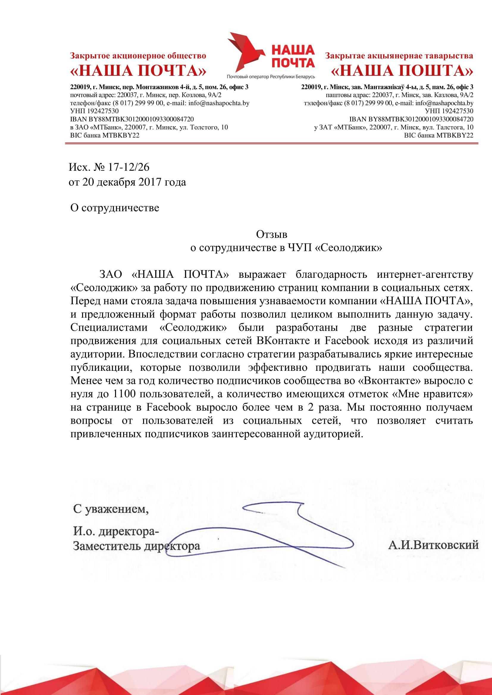 ЗАО «НАША ПОЧТА» выражает благодарность интернет-агентству «Сеолоджик» за работу по...