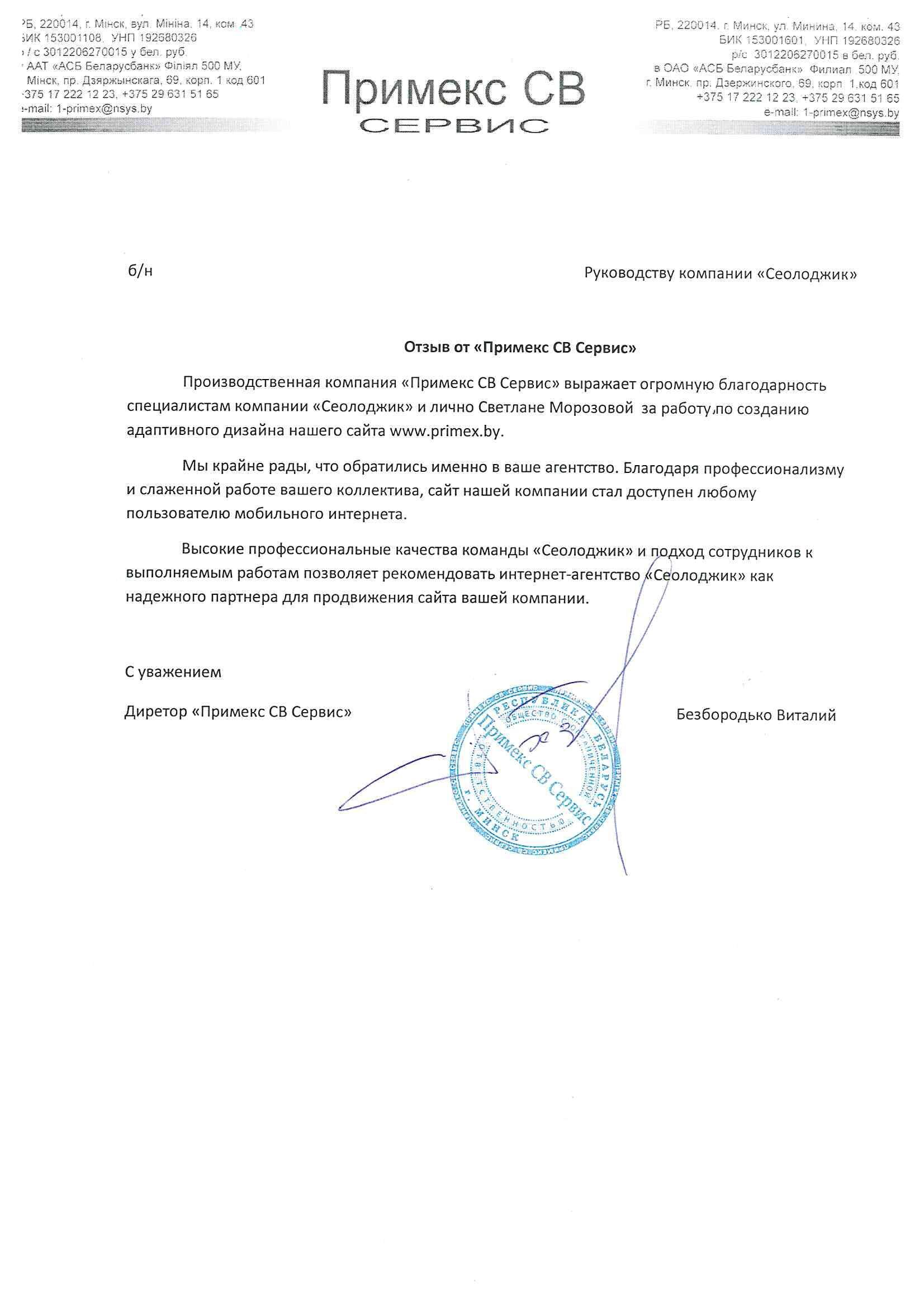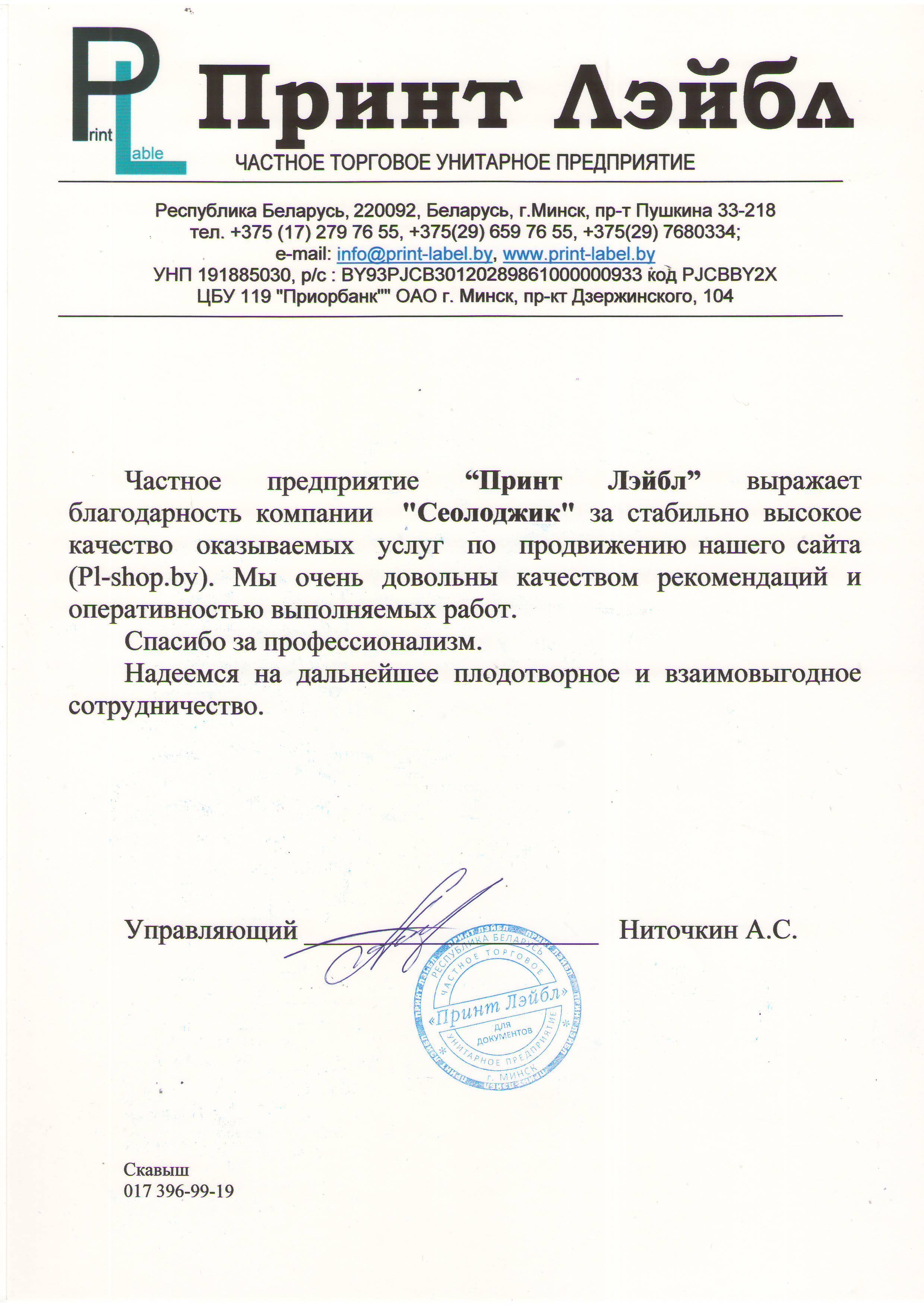 Частное предприятие «Принт Лэйбл» выражает благодарность компании «Сеолоджик» за стабильно...