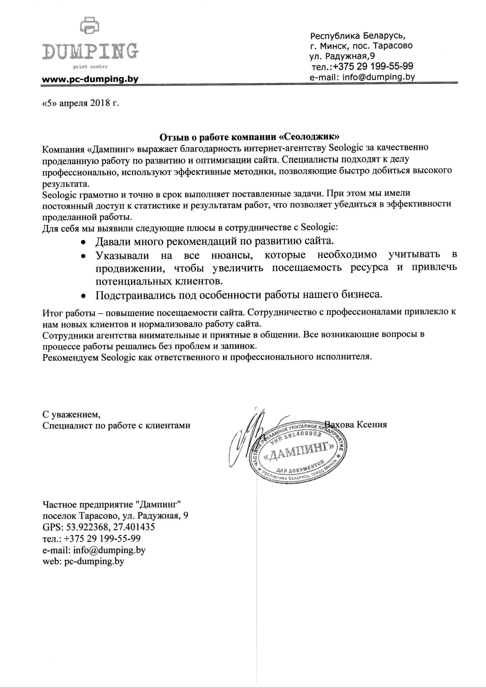 Компания «Дампинг» выражает благодарность интернет-агентству Seologic за качественно проделанную работу...