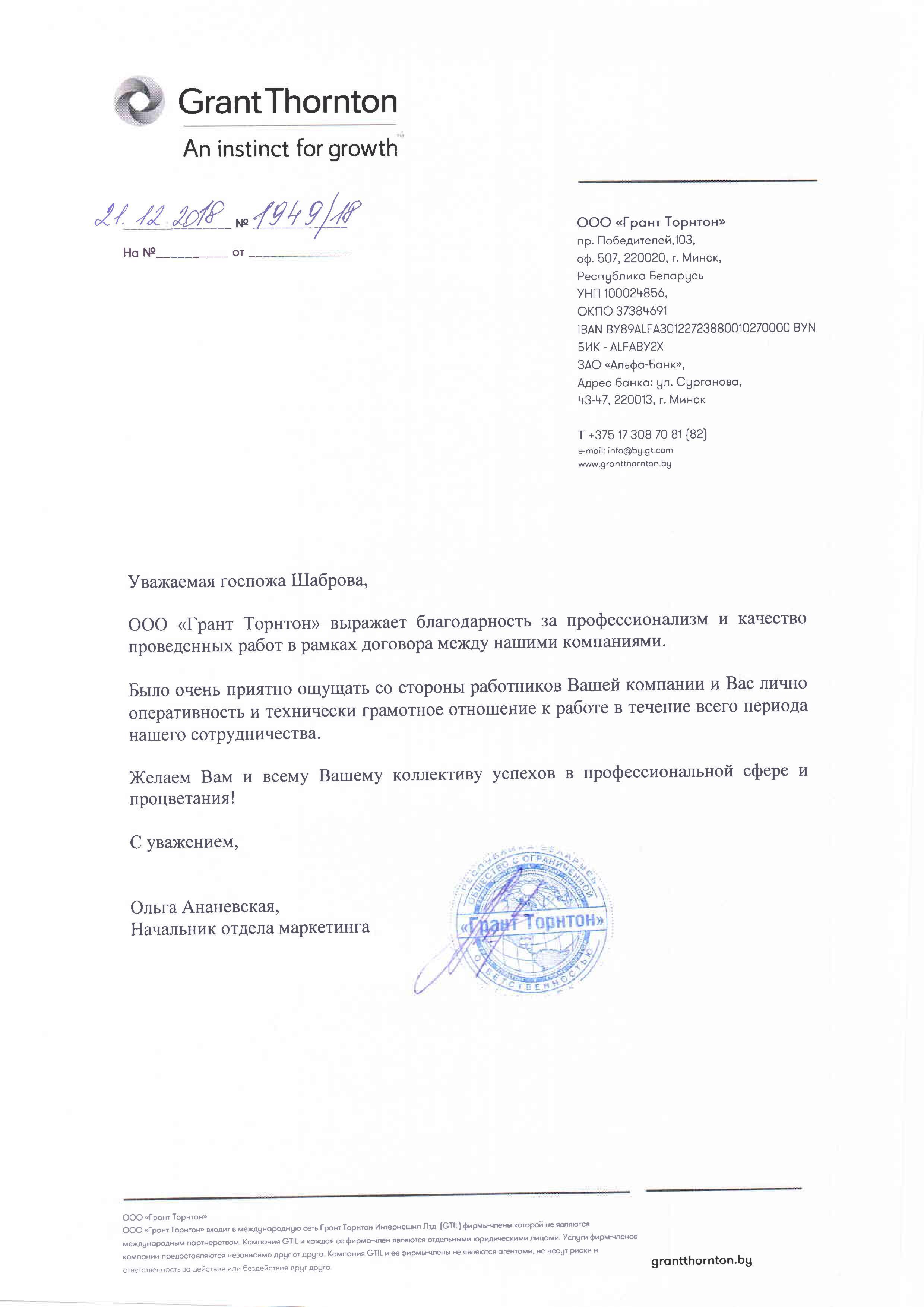 ООО «Грант Торнтон» выражает благодарность за профессионализм и качество проведенных...