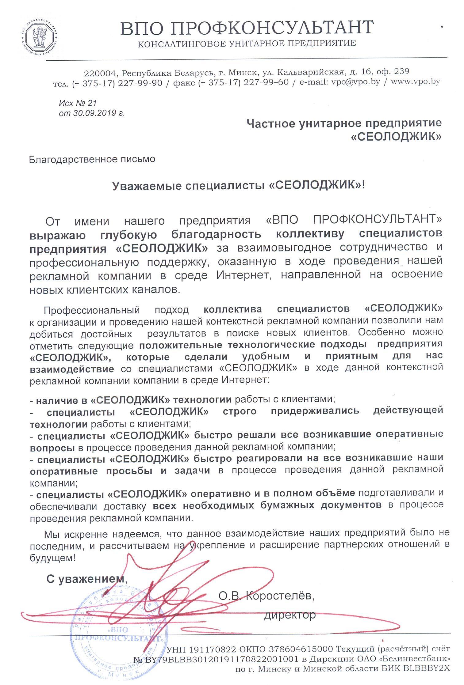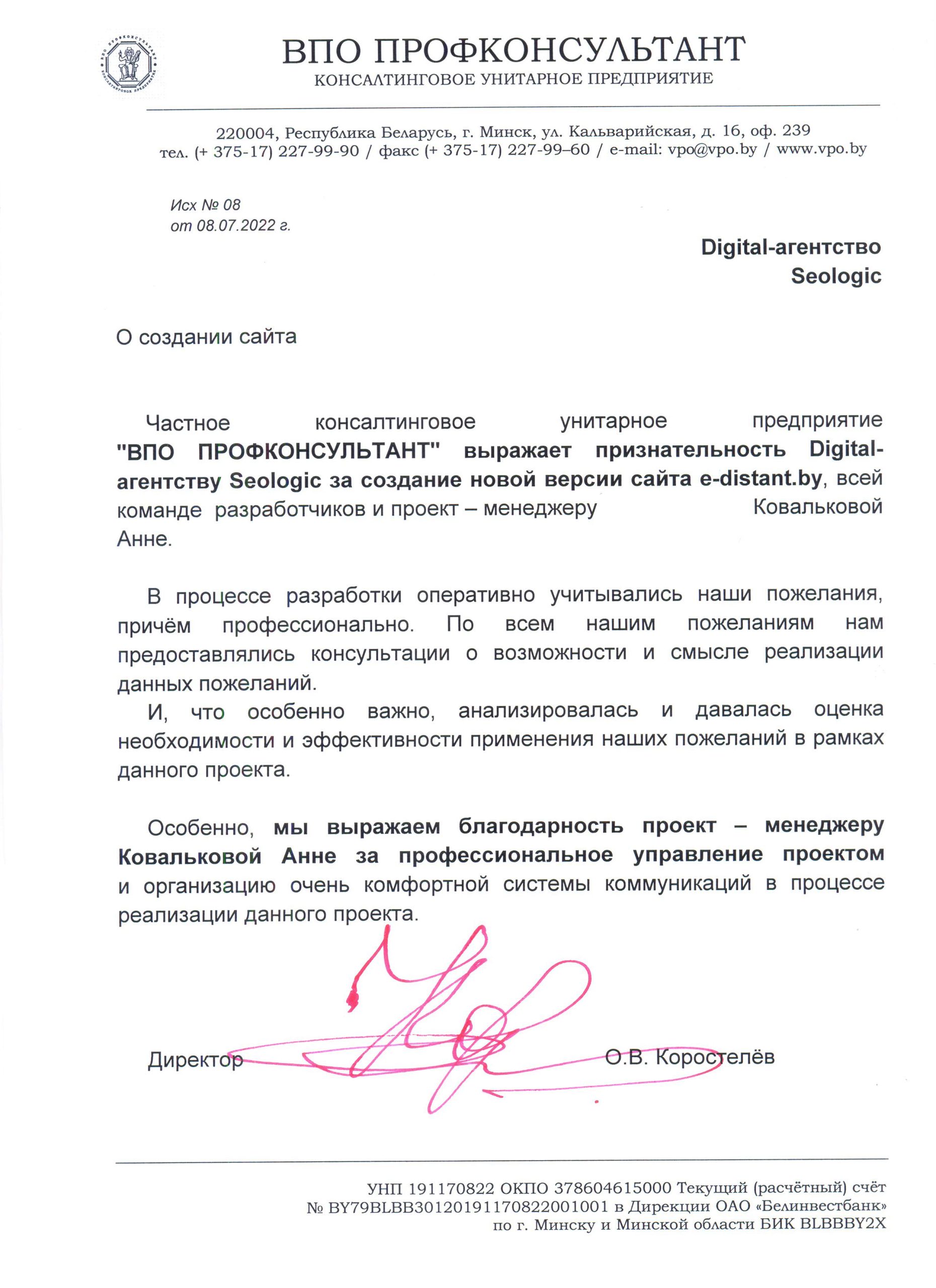 Частное консалтинговое унитарное предприятие "ВПО ПРОФКОНСУЛЬТАНТ" выражает признательность Digital-агентству Seologic...