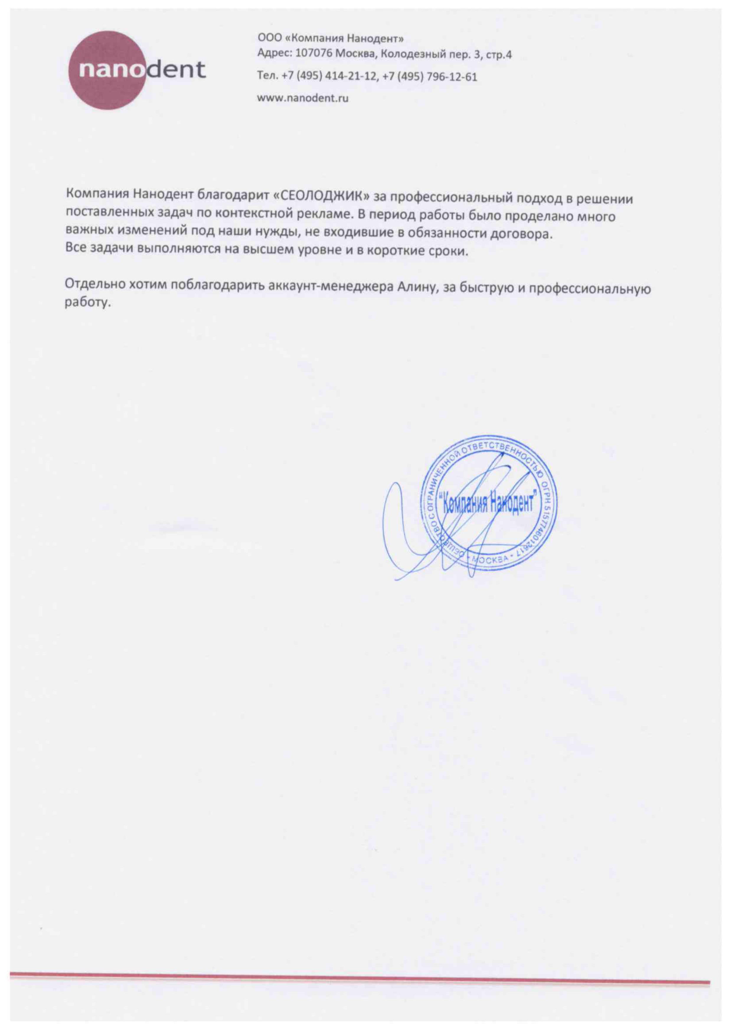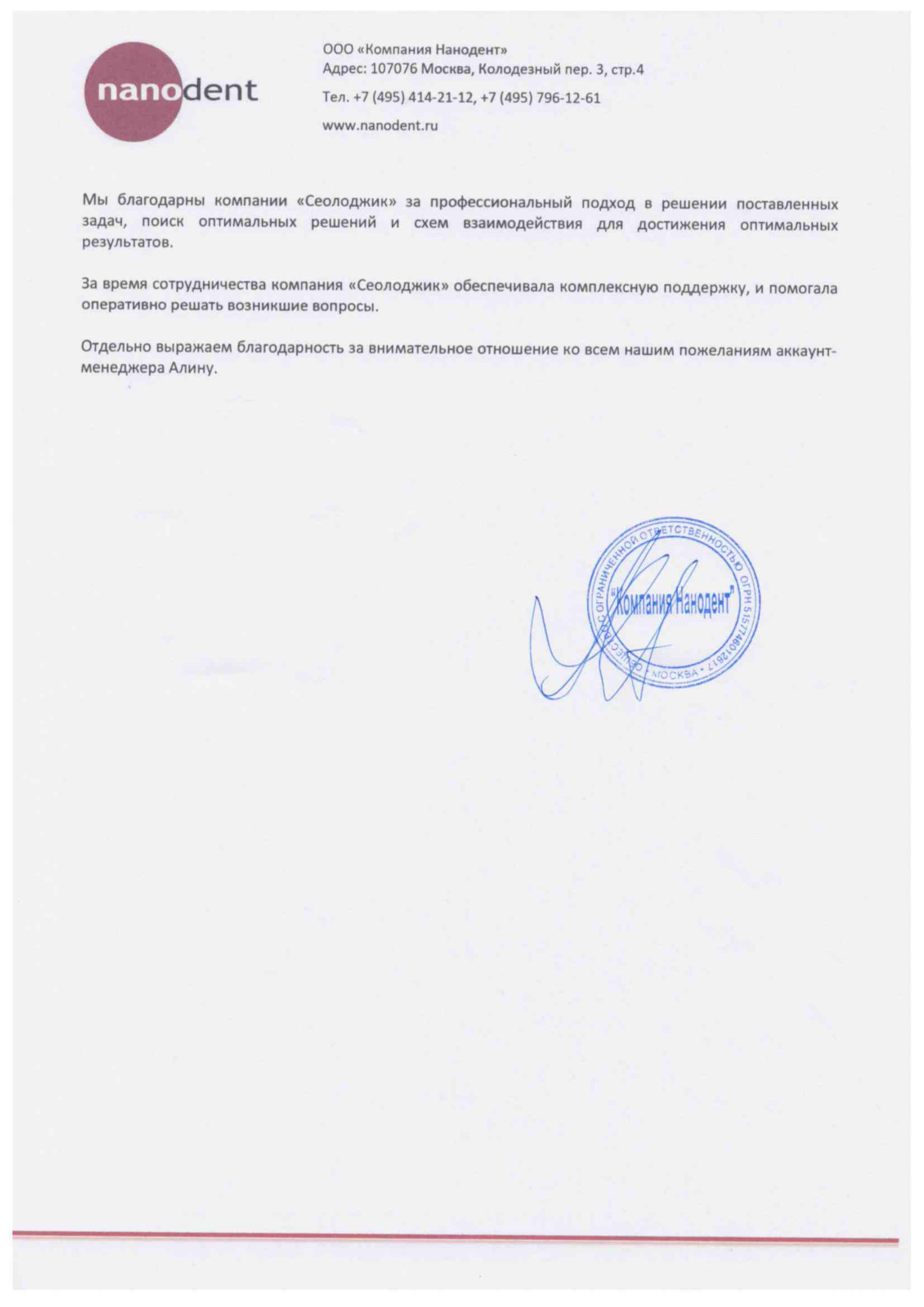 Компания Нанодент благодарит «СЕОЛОДЖИК» за профессиональный подход в решении поставленных...