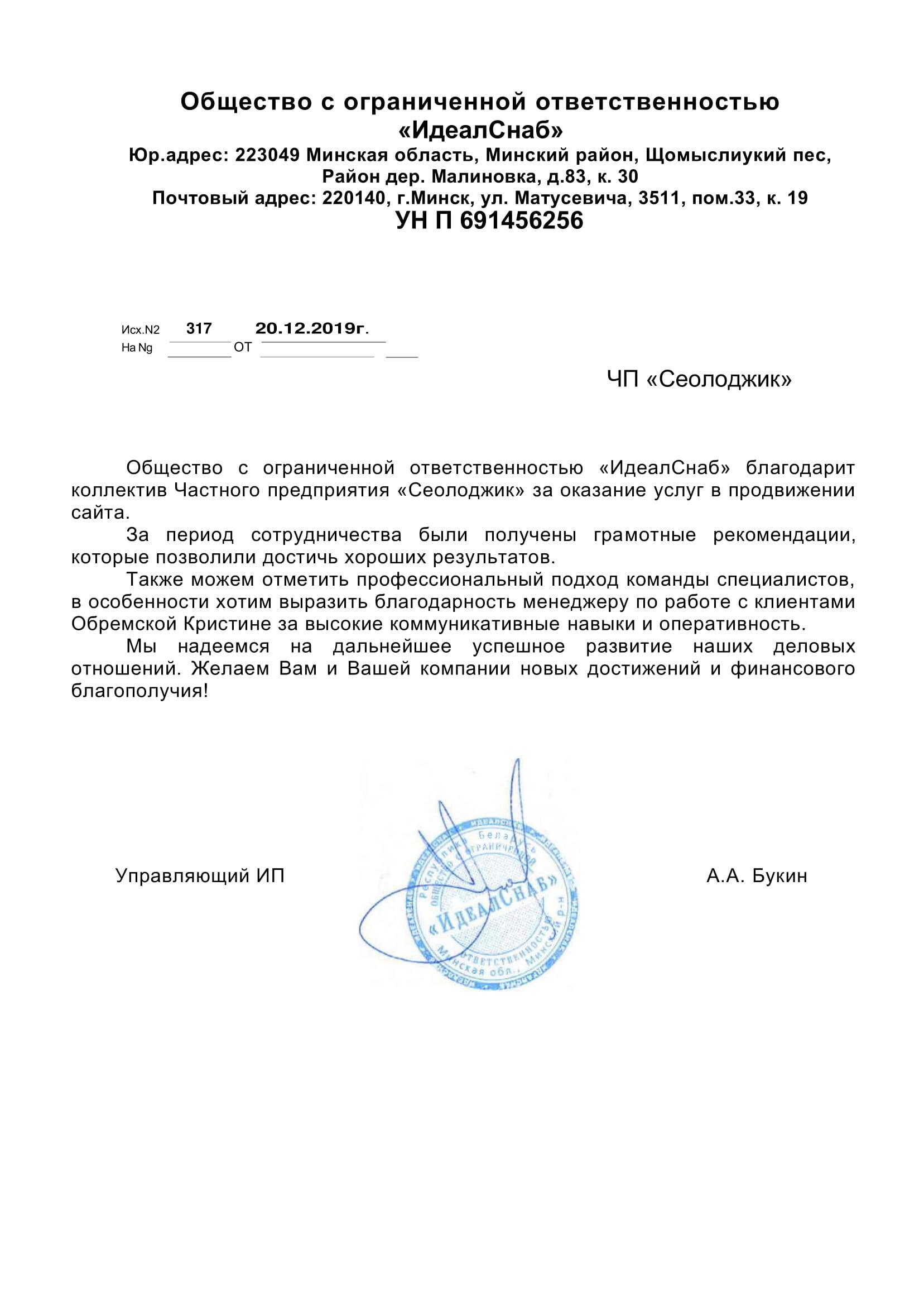 Общество с ограниченной ответственностью «ИдеалСнаб» благодарит коллектив Частного предприятия «Сеолоджик»...