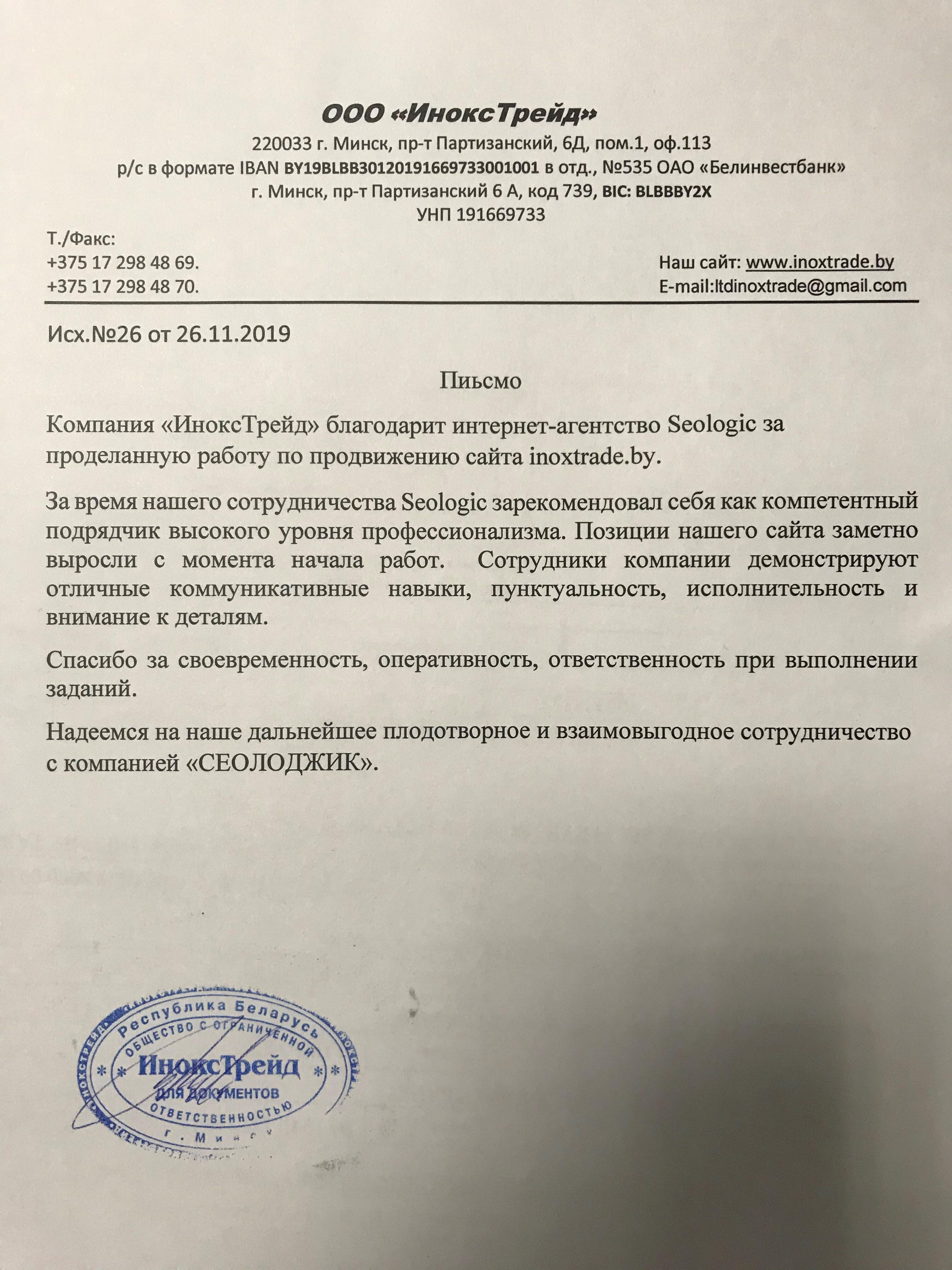 Компания «ИноксТрейд» благодарит интернет-агентство Seologic за проделанную работу по продвижению...