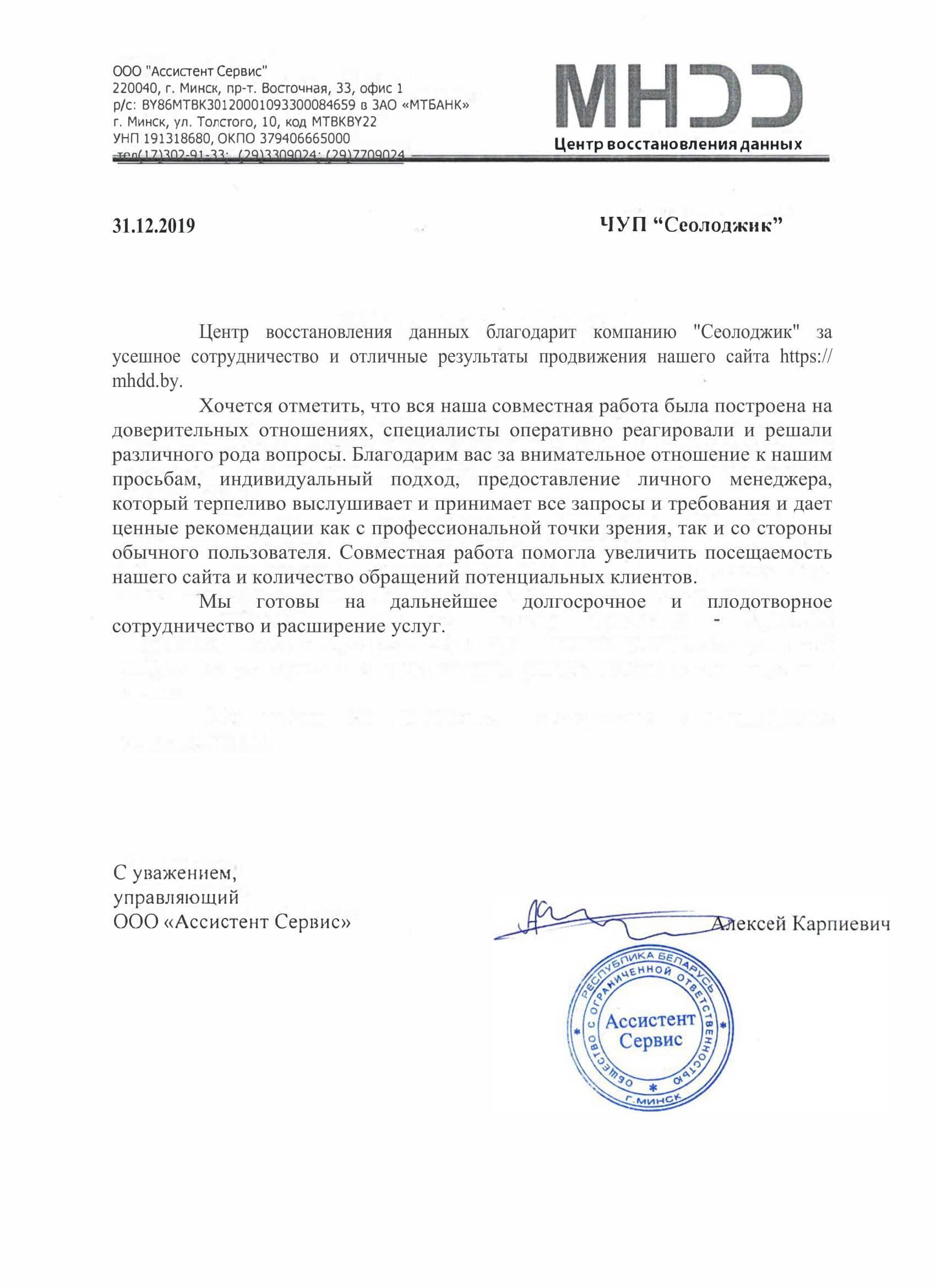 Центр восстановления данных благодарит компанию "Сеолоджик" за успешное сотрудничество и...
