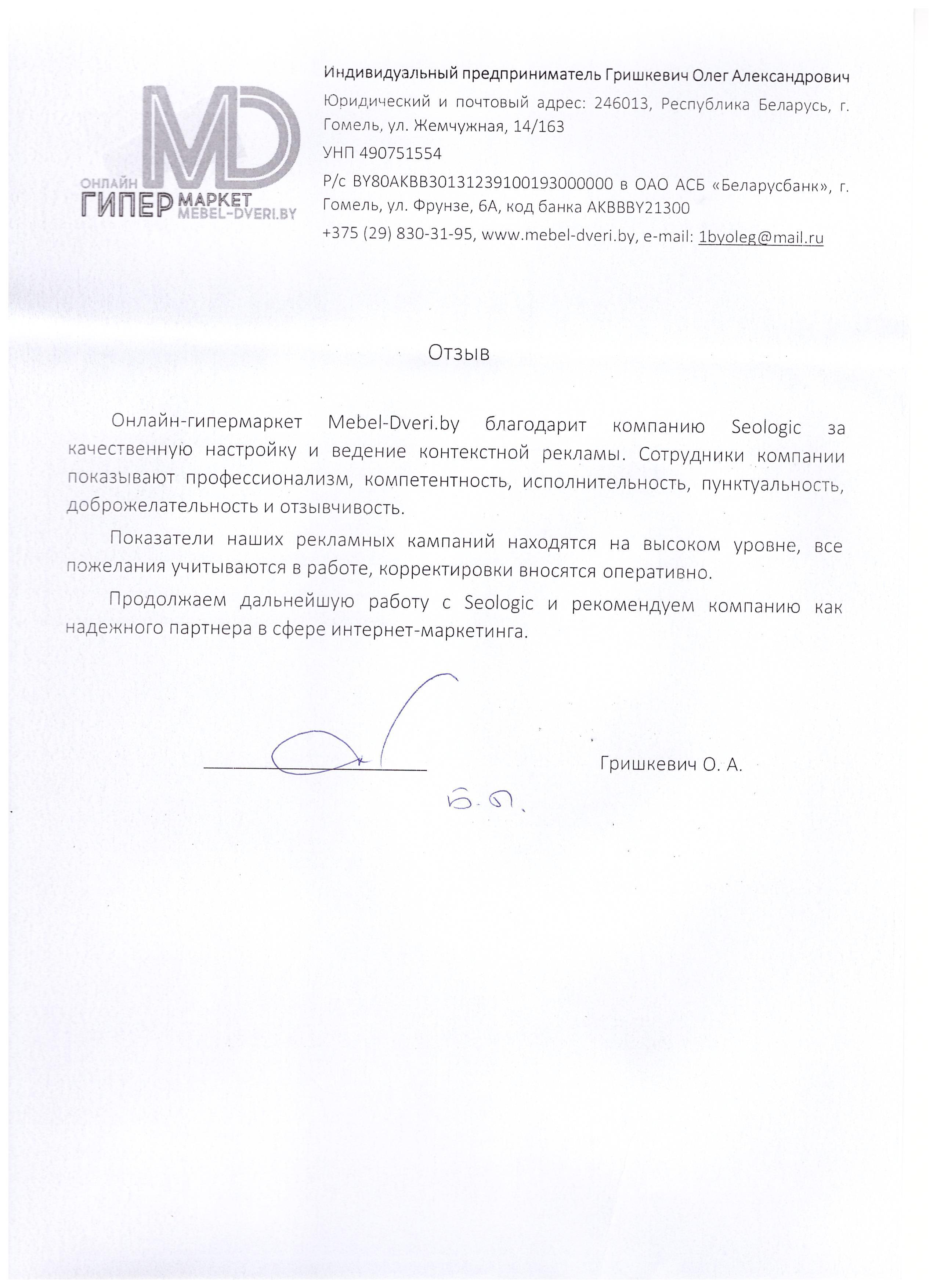 Онлайн-гипермаркет Mebel-Dveri.by благодарит компанию Seologic за качественную настройку и ведение...