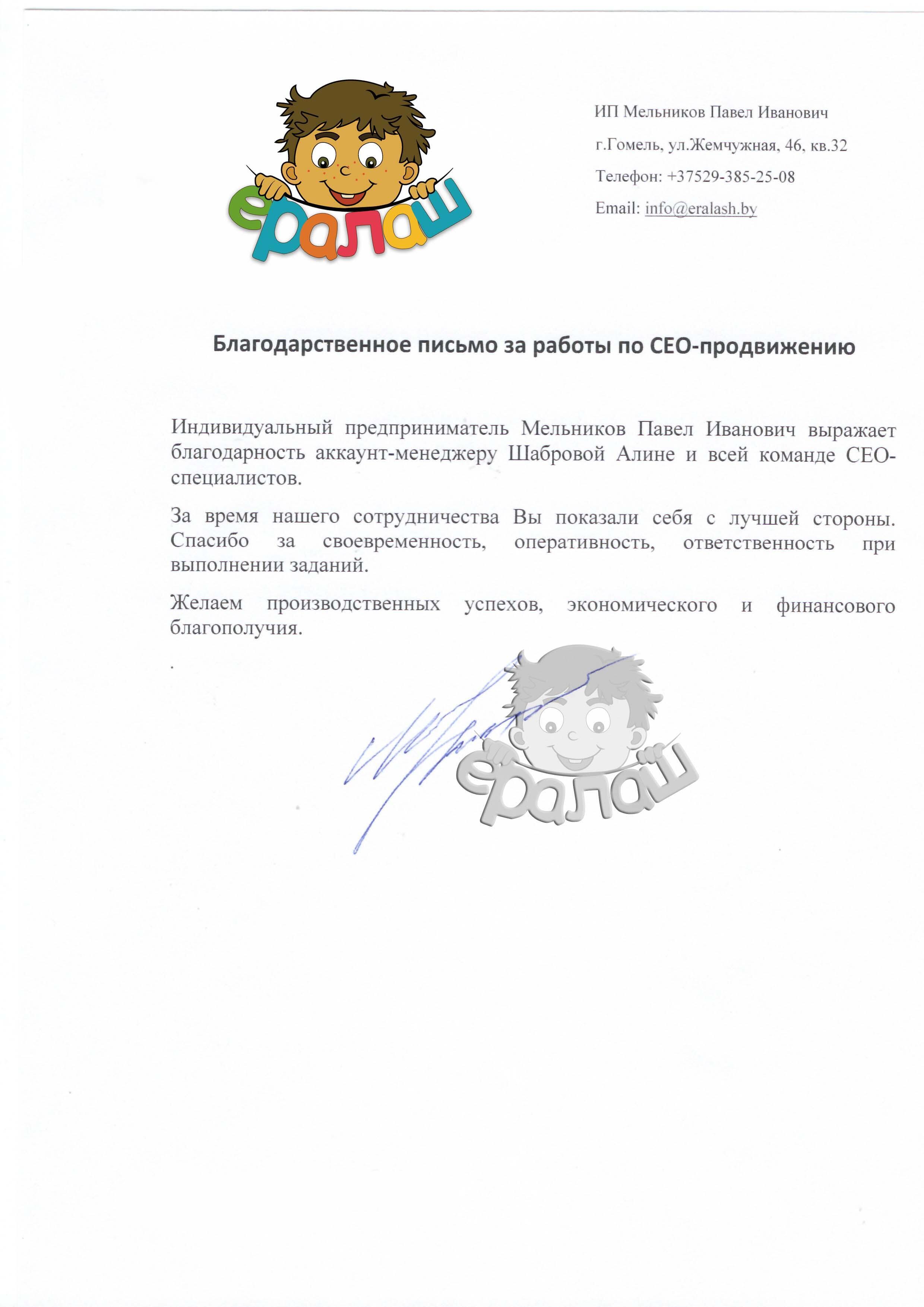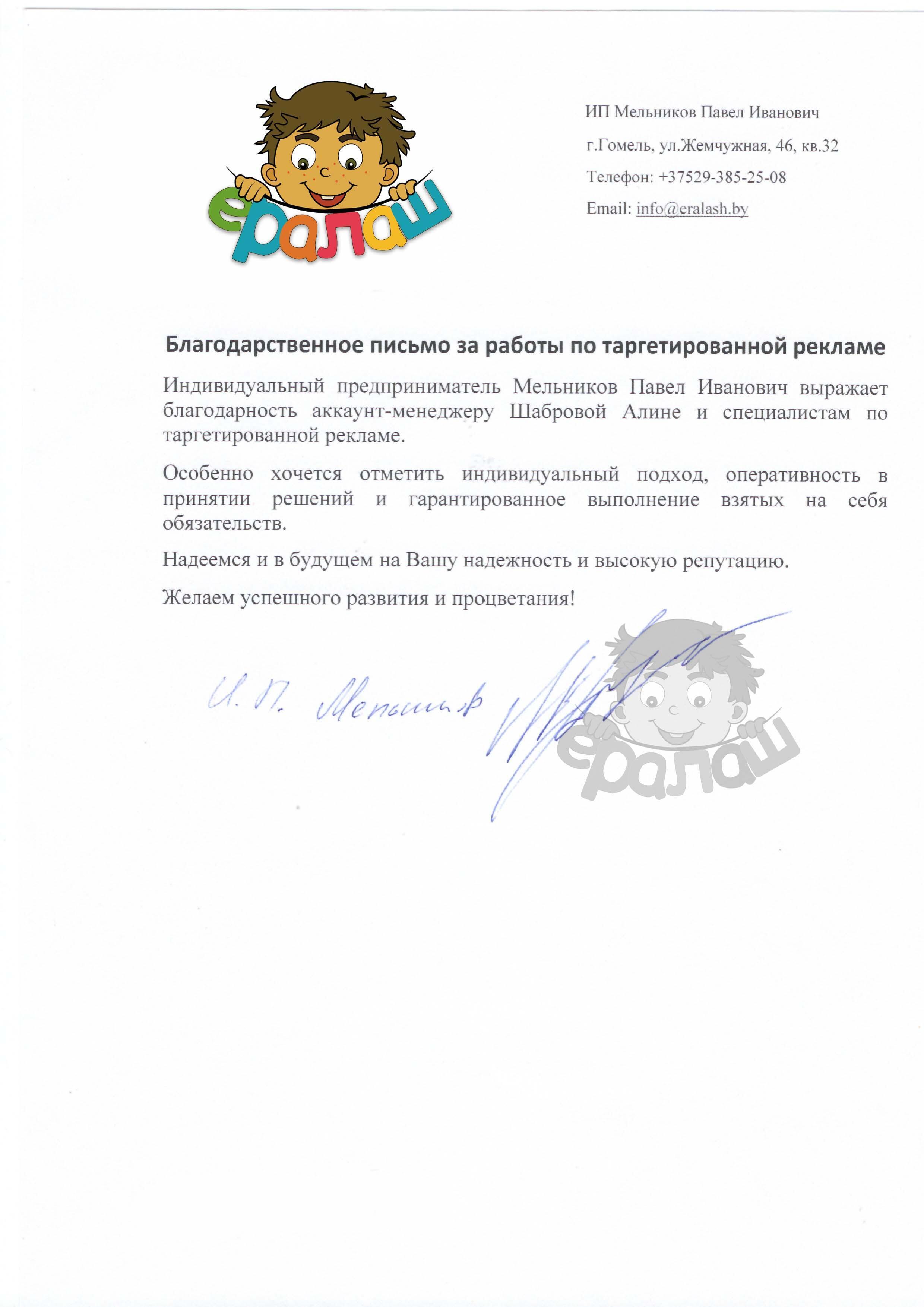 Индивидуальный предприниматель Мельников Павел Иванович выражает благодарность аккаунт-менеджеру Шабровой Алине...