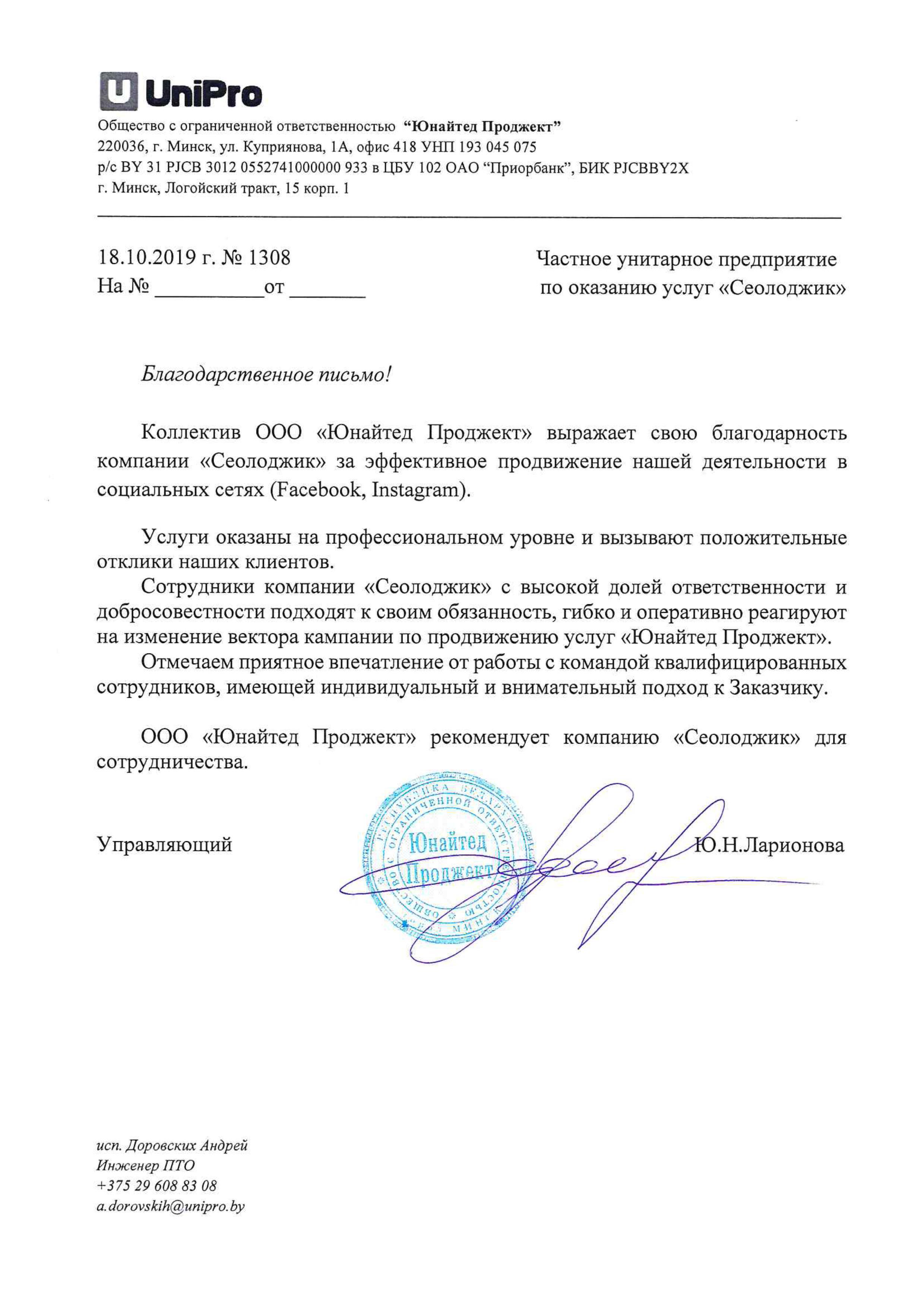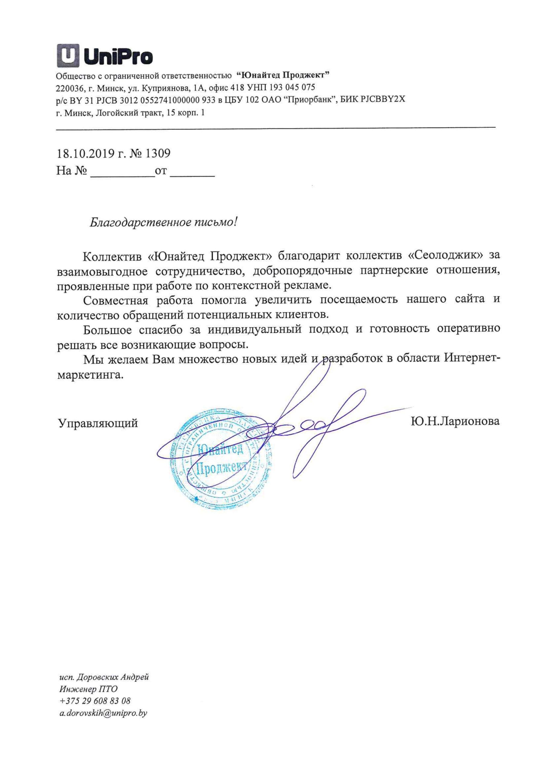 Коллектив ООО «Юнайтед Проджект» выражает свою благодарность компании «Сеолоджик» за...